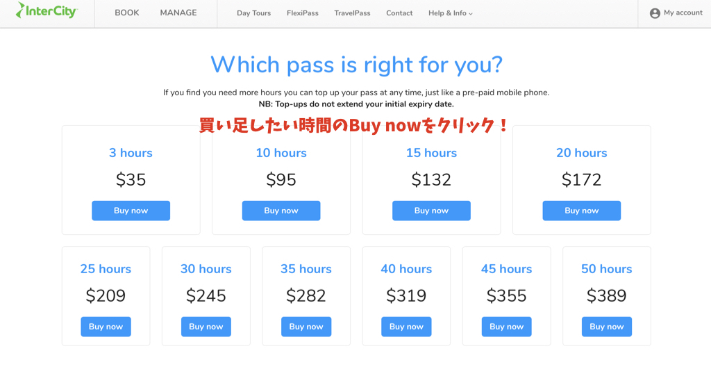 バスのトータル乗車時間に合わせて、パスを買える仕組み。しっかり縦断するなら60時間分を買うのがよいみたい(右上)バスの時間が足りなくなったら時間の追加も可能(右下)😋😎!