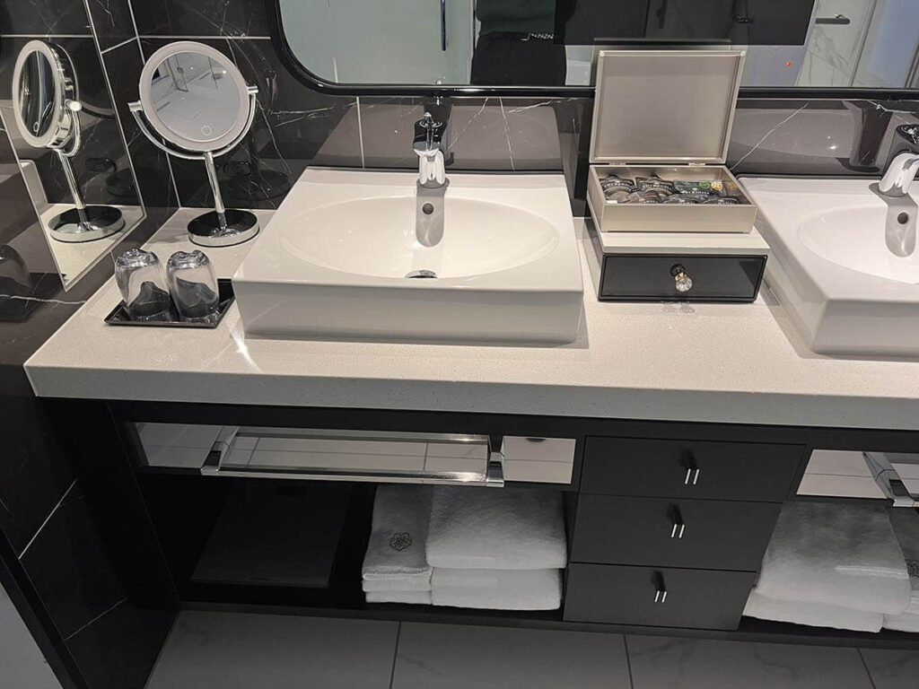 全体的に白と黒の大理石風で整えられており、高級あふれるゴージャスな内装。海外セレブ受けしそうな雰囲気だなあなんて思います。