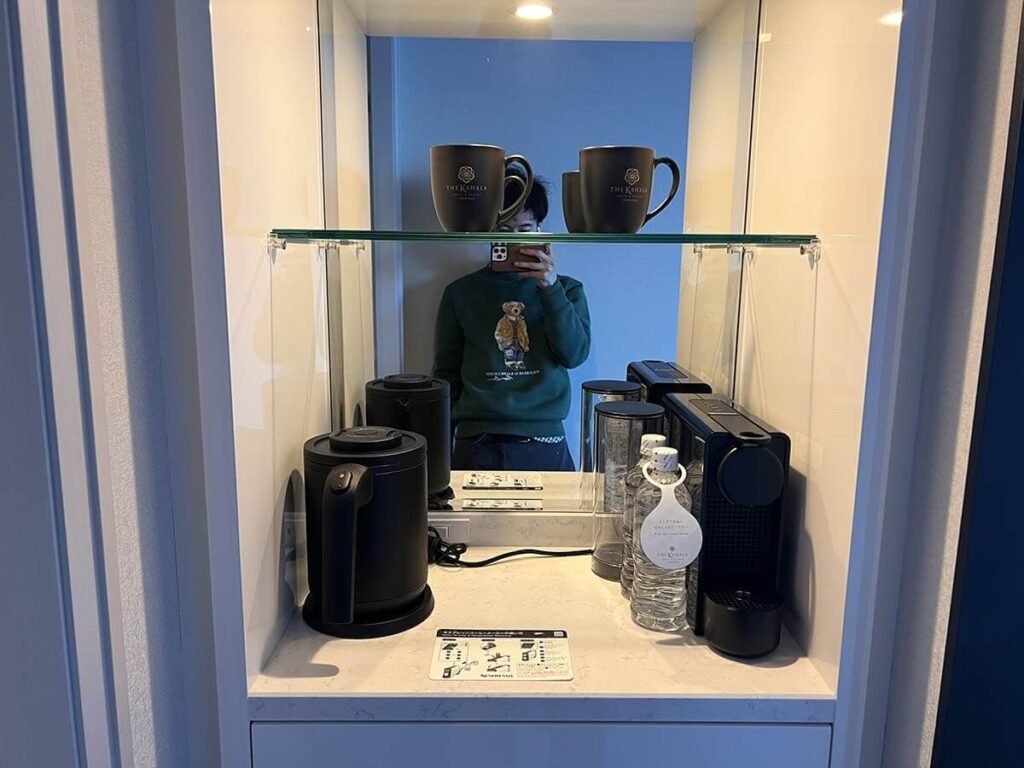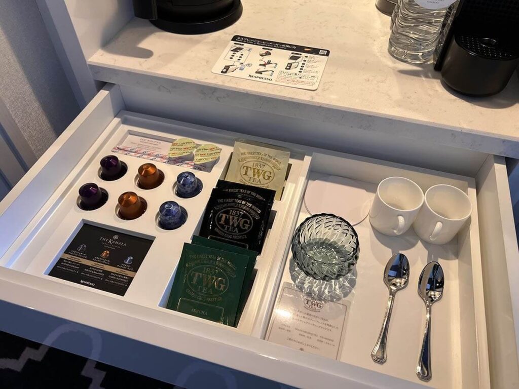 ザ・カハラ・ホテル&リゾート横浜のロゴ入りのマグカップに、お決まりのネスプレッソ。冷蔵庫には飲み物。コーラやお茶など定番ものがしっかり揃っています。