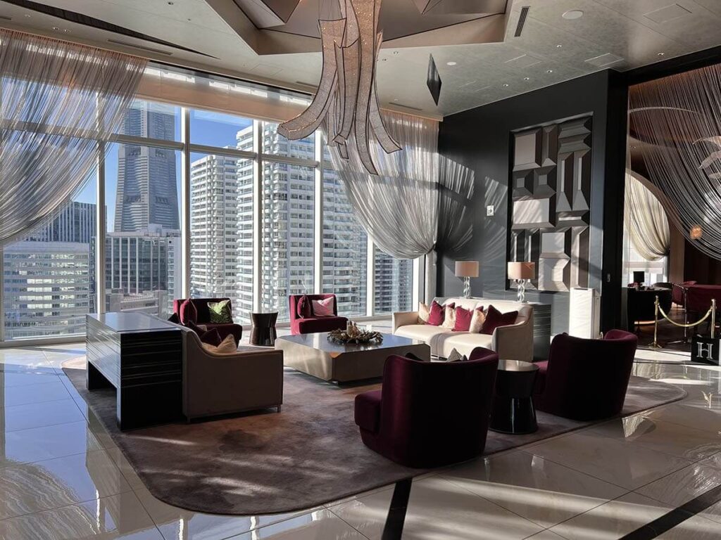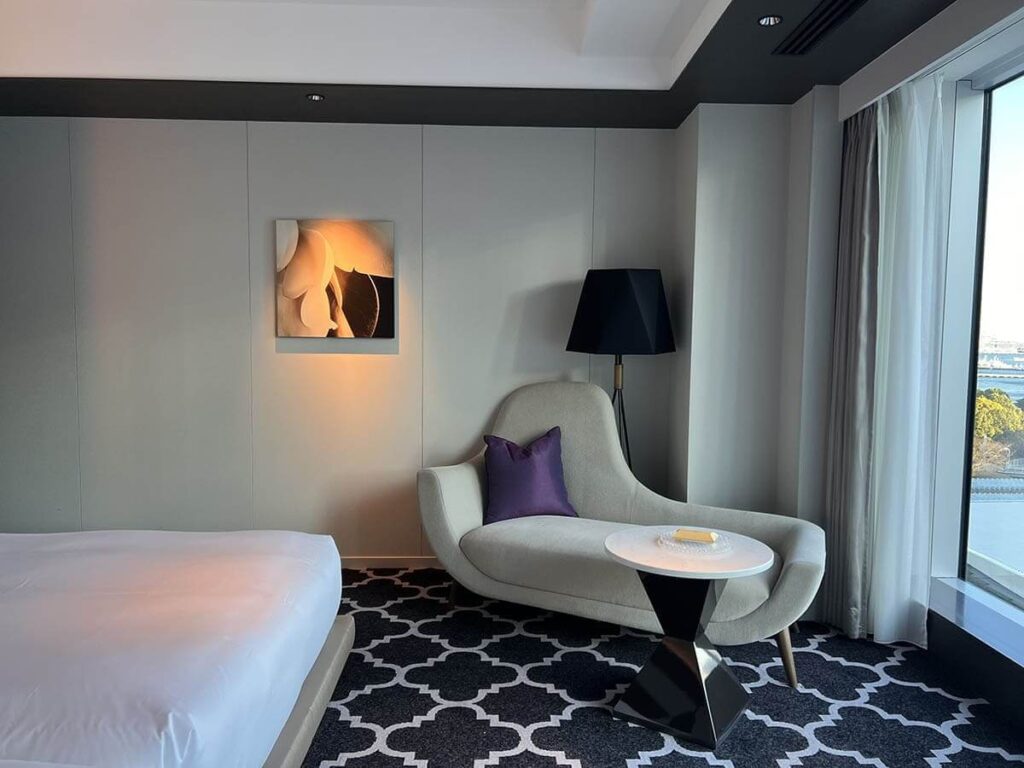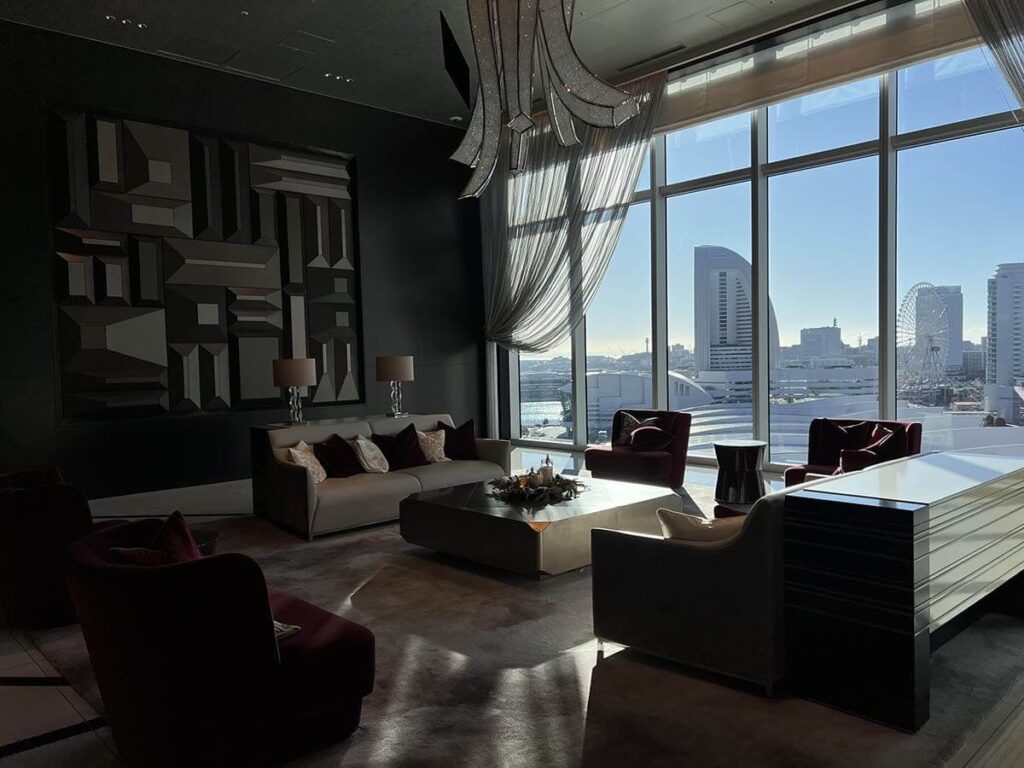 既視感のないシャンデリアに、紫を差し色に使った高級感あふれるレセプションフロア。壁一面に広がる窓からは、グランドインターコンチネンタルといったみなとみらい方面が一望。(風景は、インターコンチネンタル 横浜Pier8のほうがよさげです。)