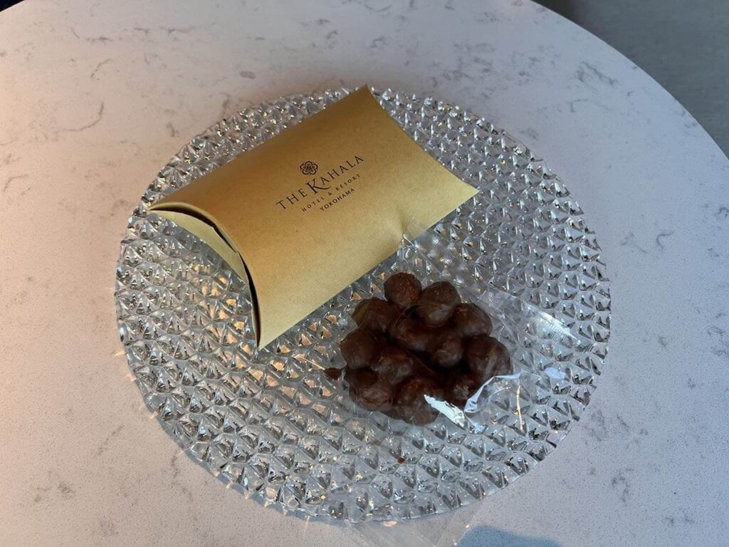 テーブルには、チョコレートにコーディングされたマカダミアナッツ。ハワイ発祥所以のウェルカムフルーツですね。1階にあるブティックでも購入可能で、お土産にもぴったり。