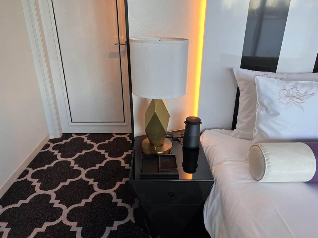 ベッドサイドにあるランプは、テーマとされるクリスタルデザインのよう。色が金色でエレガントな印象を与えますよね。空間に邪魔しないデザインがすてきです。