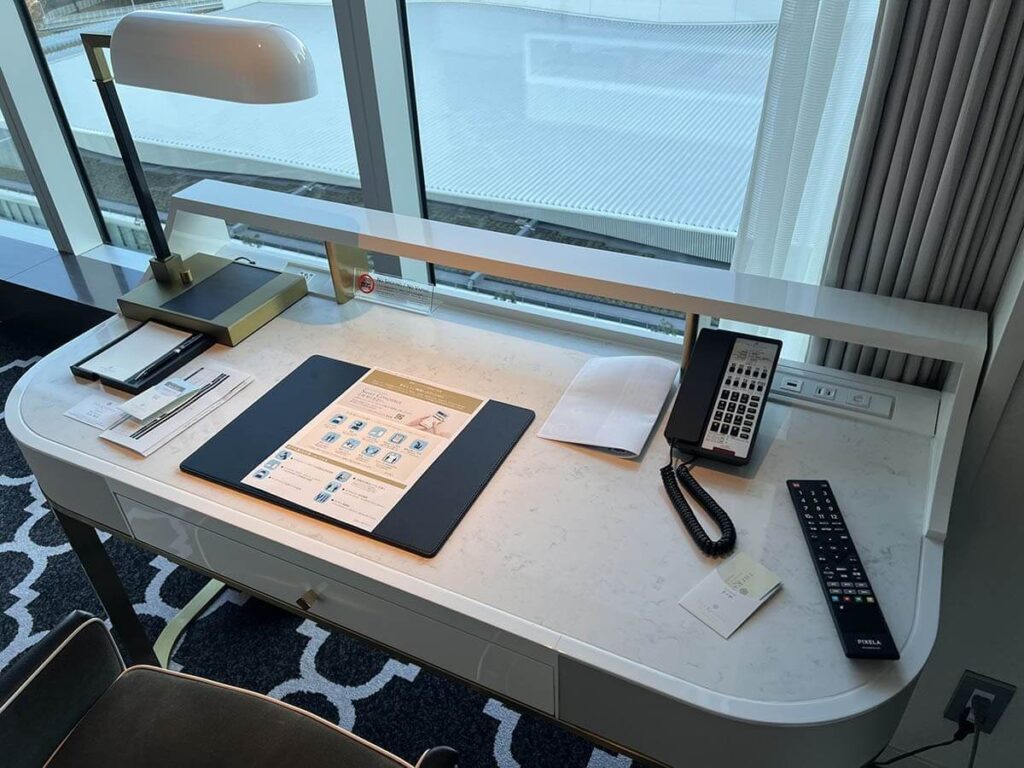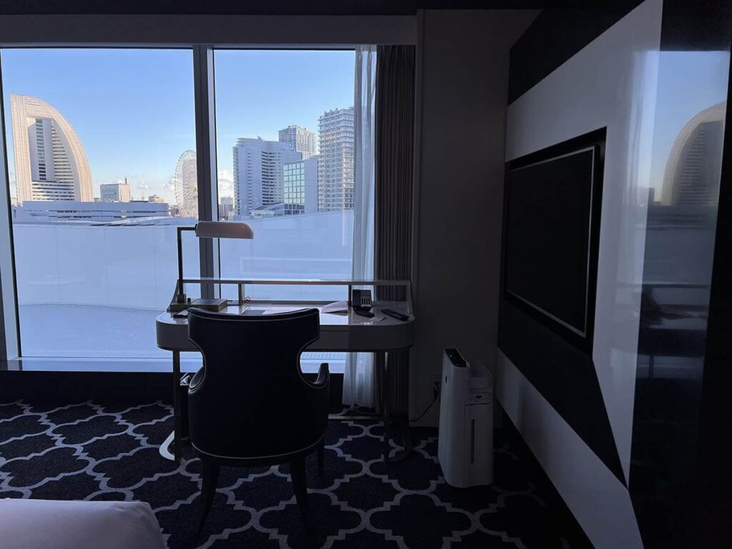 ホテル全体で取り入れられている白×黒のデザインがここにも。反対に見られる横浜方面の眺望とのギャップが面白くて好きです。ベッドも上質。ピローカバーにはオアフ島のカハラと同じようにハイビスカスの花の装飾。こういうところのこだわりこそが高級ホテルって感じがしますね。