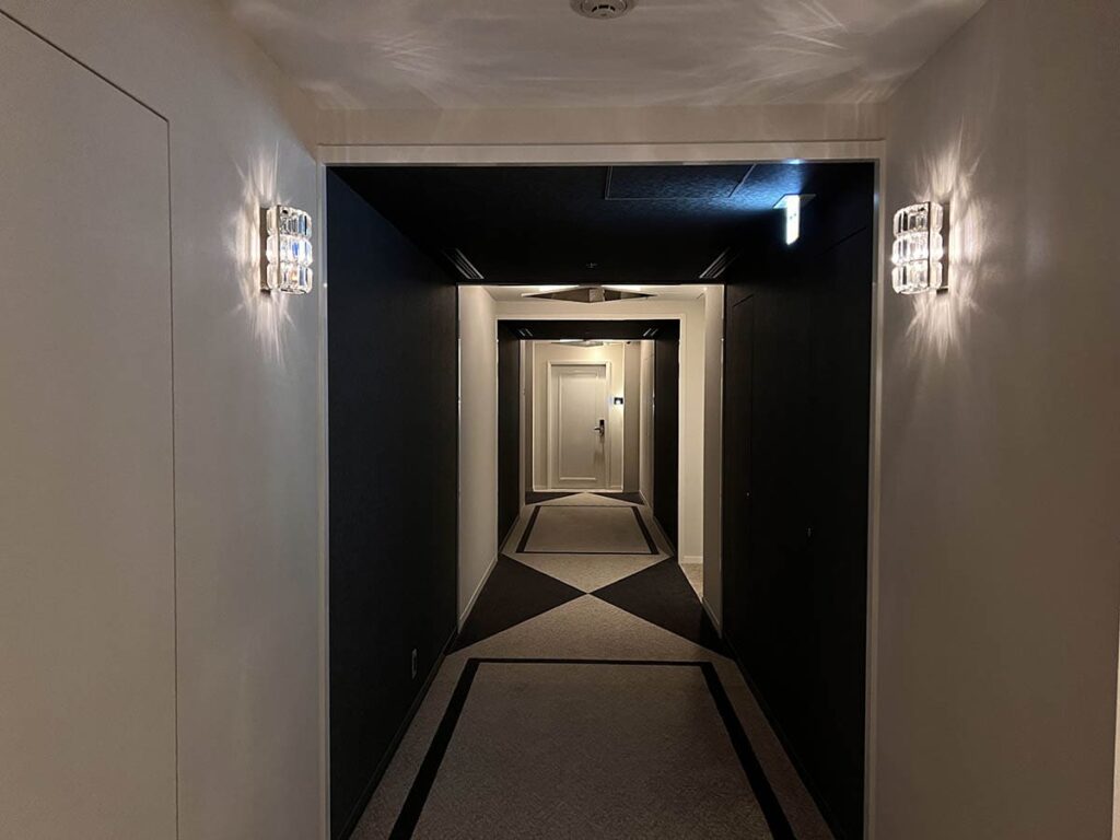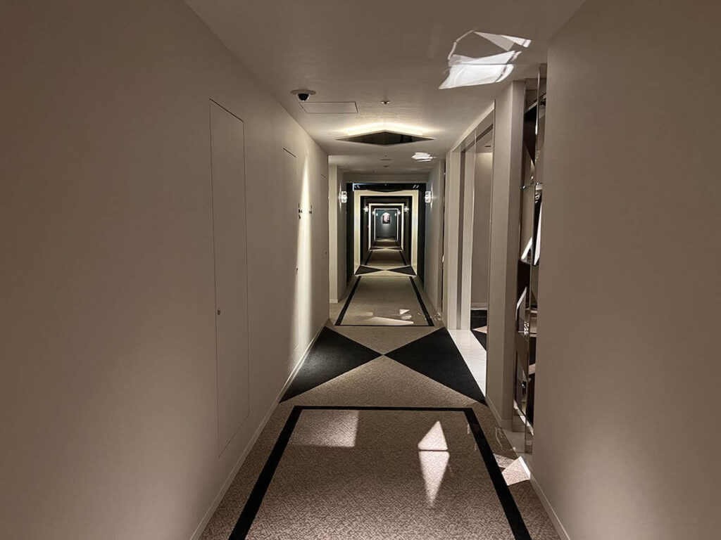 お部屋までの通路は、他の空間同様、白×黒がコンセプト。和の要素は全くなく、洋の要素がふんだんに取り入れられた空間です。