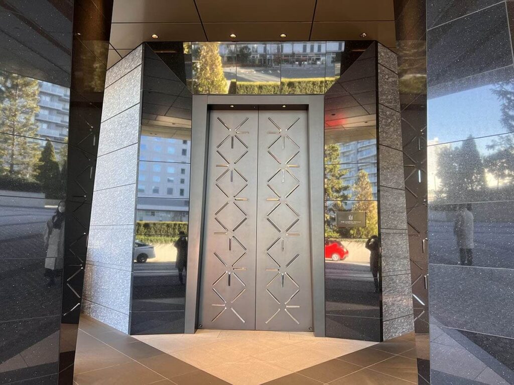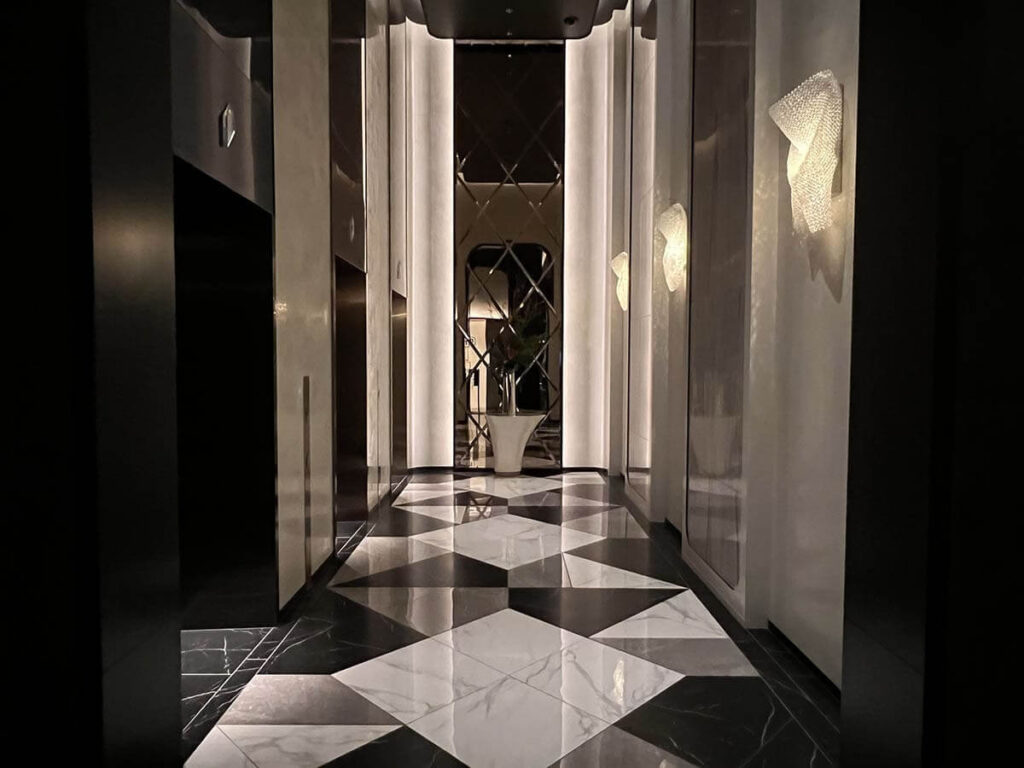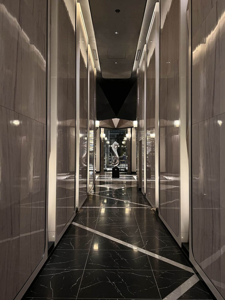 こちらがエレベーターフロア。黒と白の大理石を使った床に、天井が高く開放感あふれている作り、いわゆる「ラグジュアリー感」がこれでもかっと伝わってくる空間です。