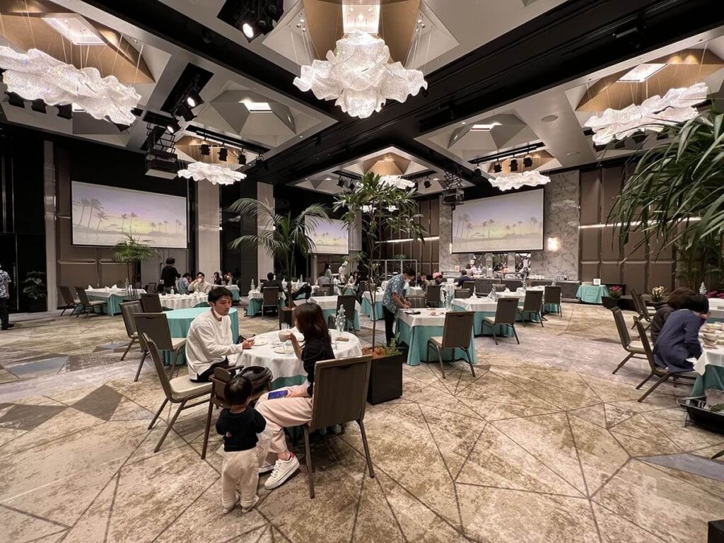 朝食レストラン会場は、レストランというより宴会場のようなところに円テーブルが配置されている形。天井が高く、開放感がたっぷり。プロジェクターでは、ハワイの映像が流れており、演出も最高。