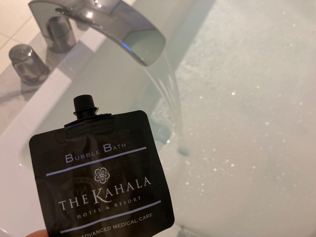 バスタブはめちゃくちゃ広く、170cmの僕でも余裕のサイズだったので、ゆっくり疲れを癒せます。珍しくバブルバスのアメニティがあるので、ぜひ非日常の1部として楽しんでみてはいかがでしょうか。