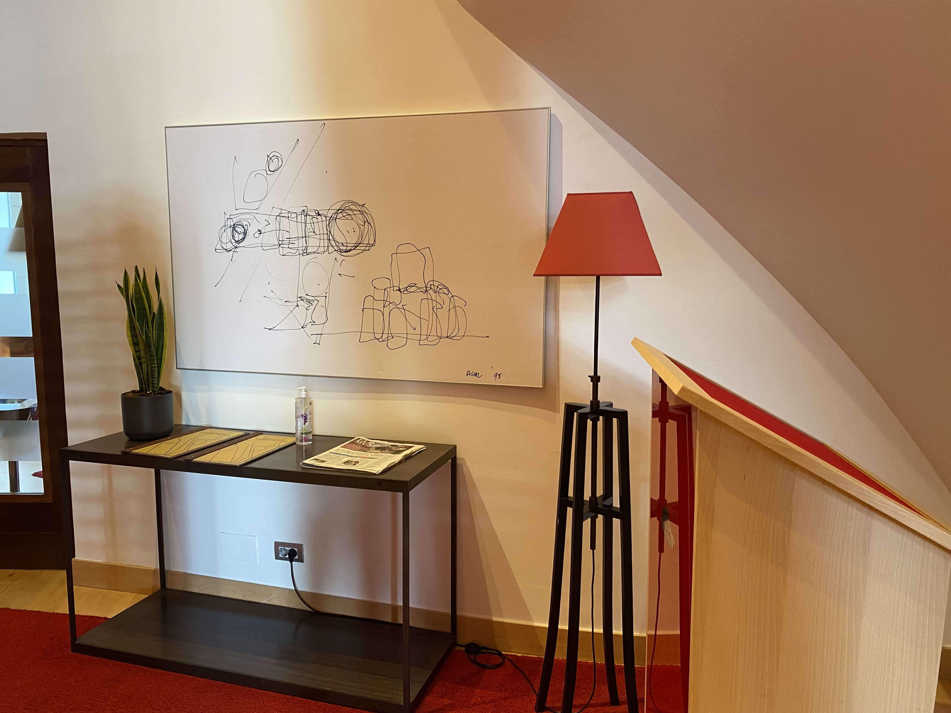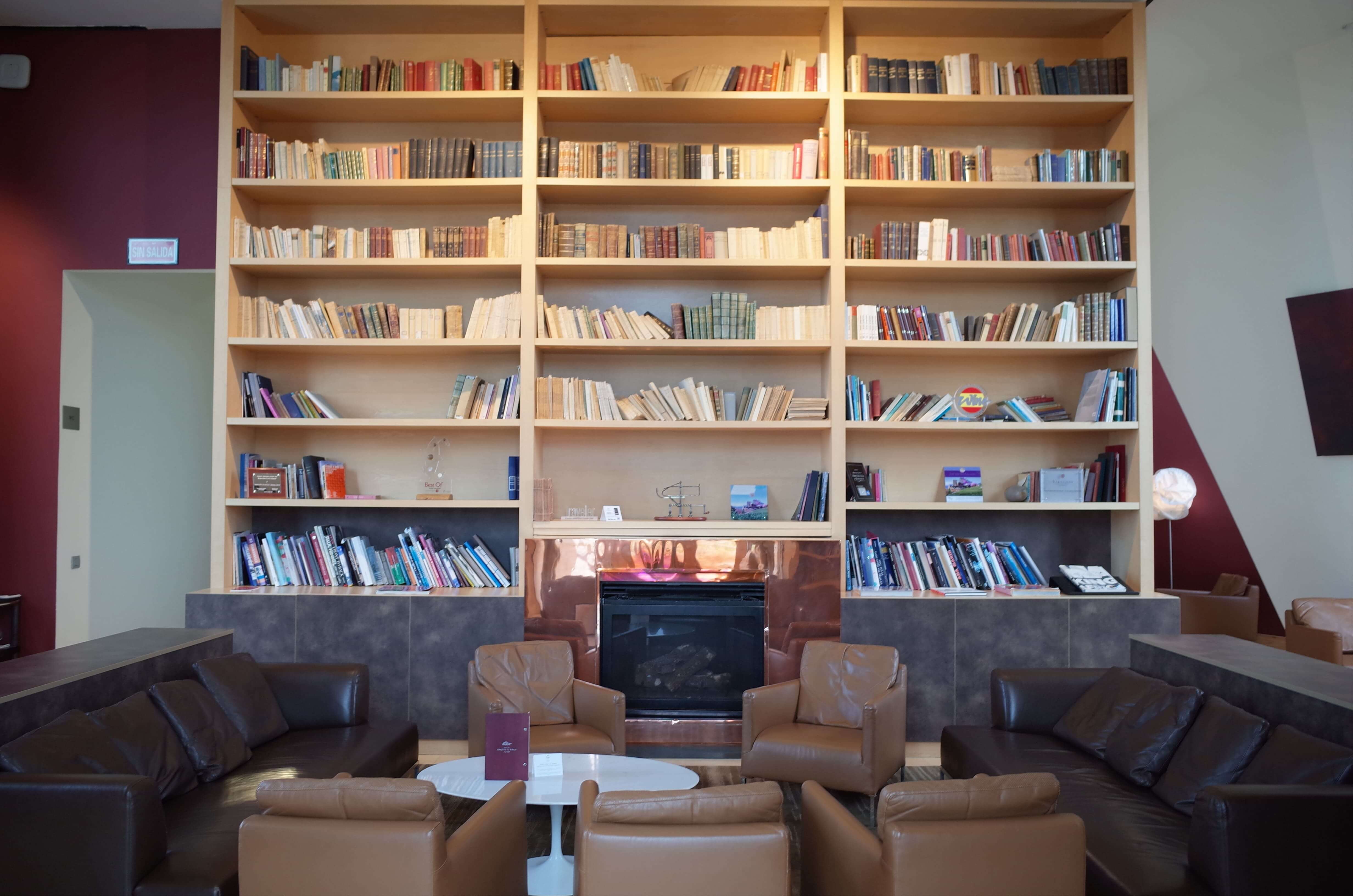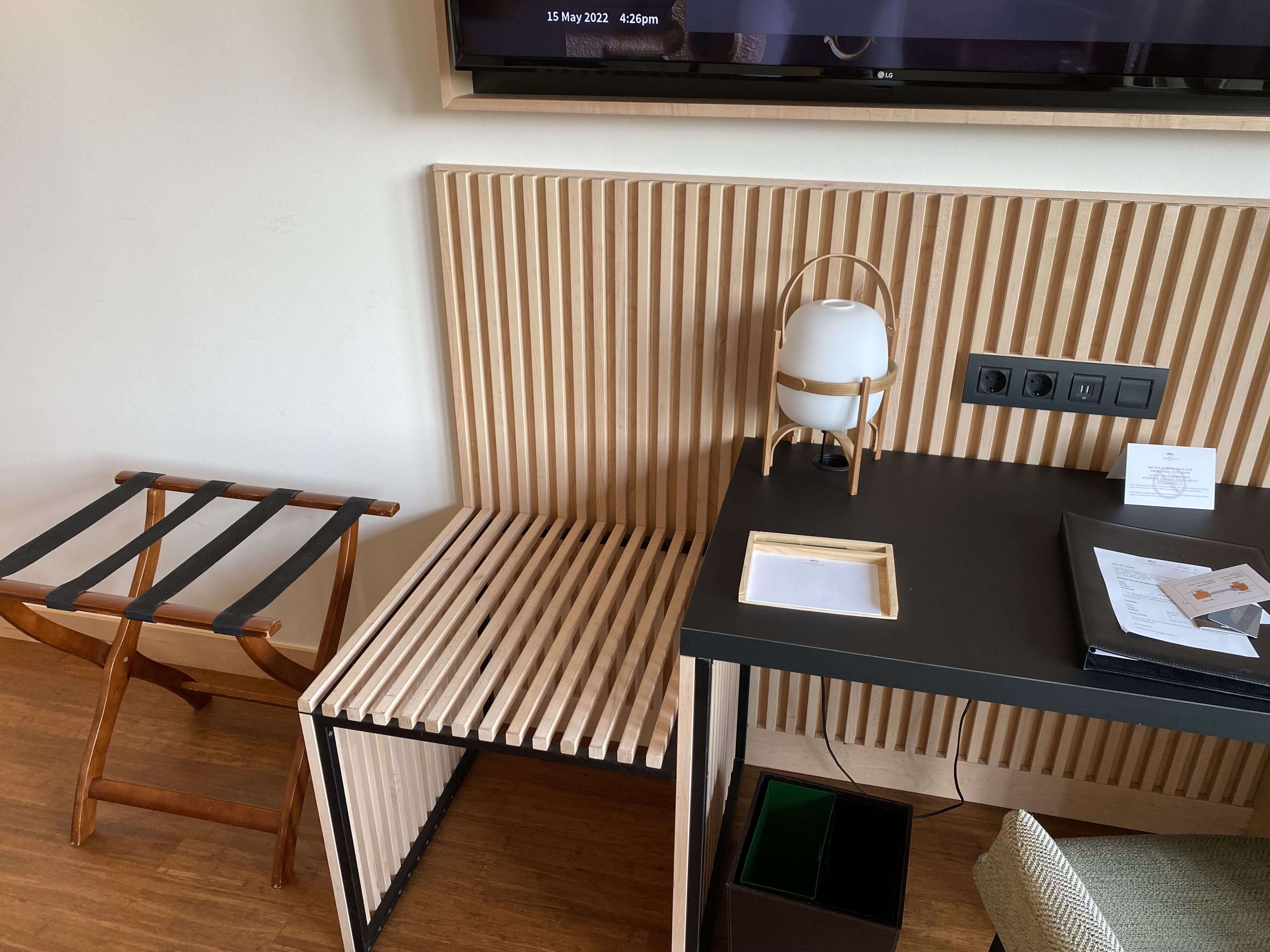 こんな感じで、ホテル内に団欒コーナーが設置されています。木目の床の優しさと赤のインテリアの刺激的な感じがとても調和していて、心地がよい空間です。最高。