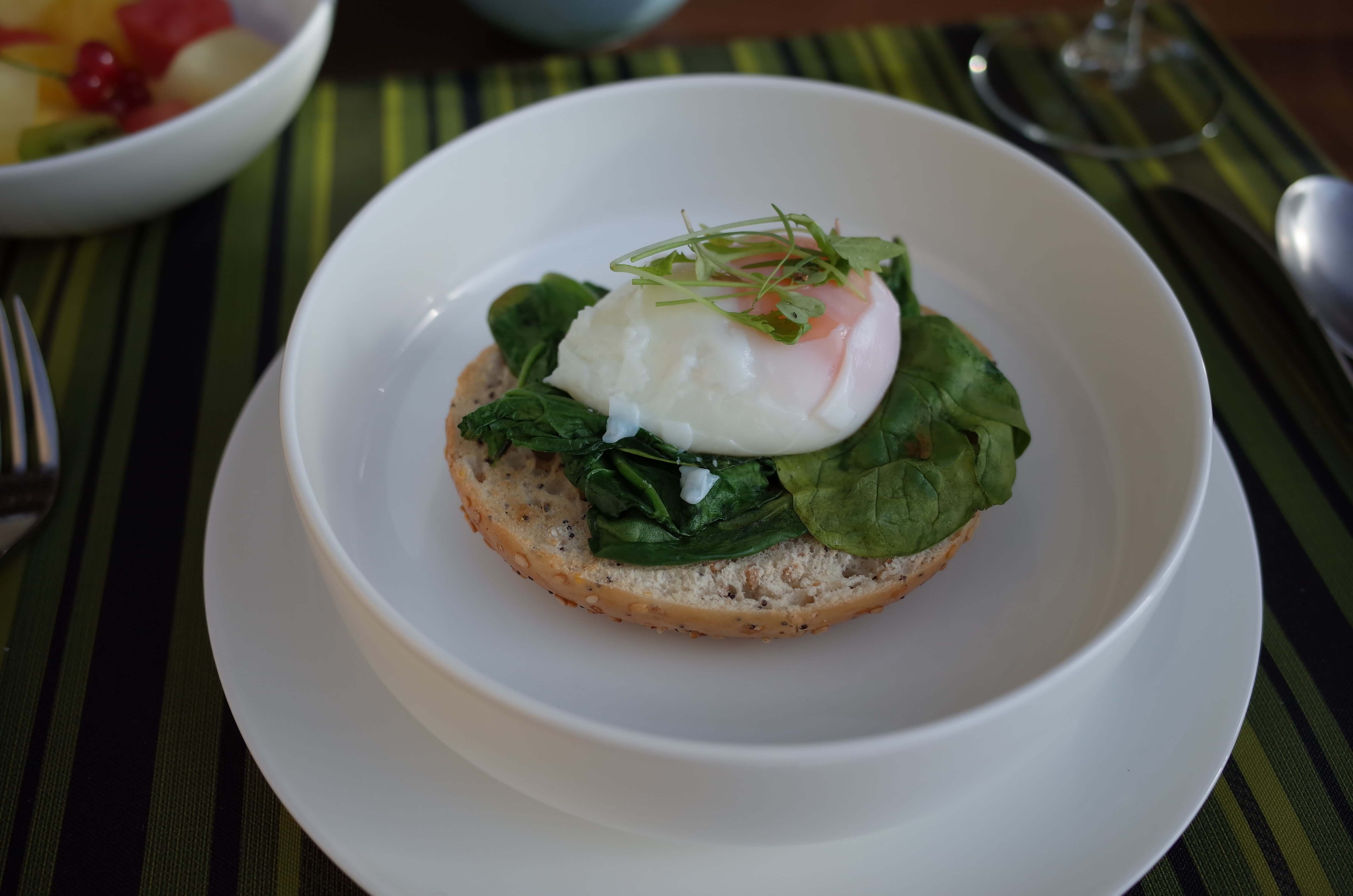 メインがこちら。ベーグル風のパンにほうれんそうとポーチドエッグ。本当ならアボカドとトマトが入るらしいのですが、抜いてもらいました笑