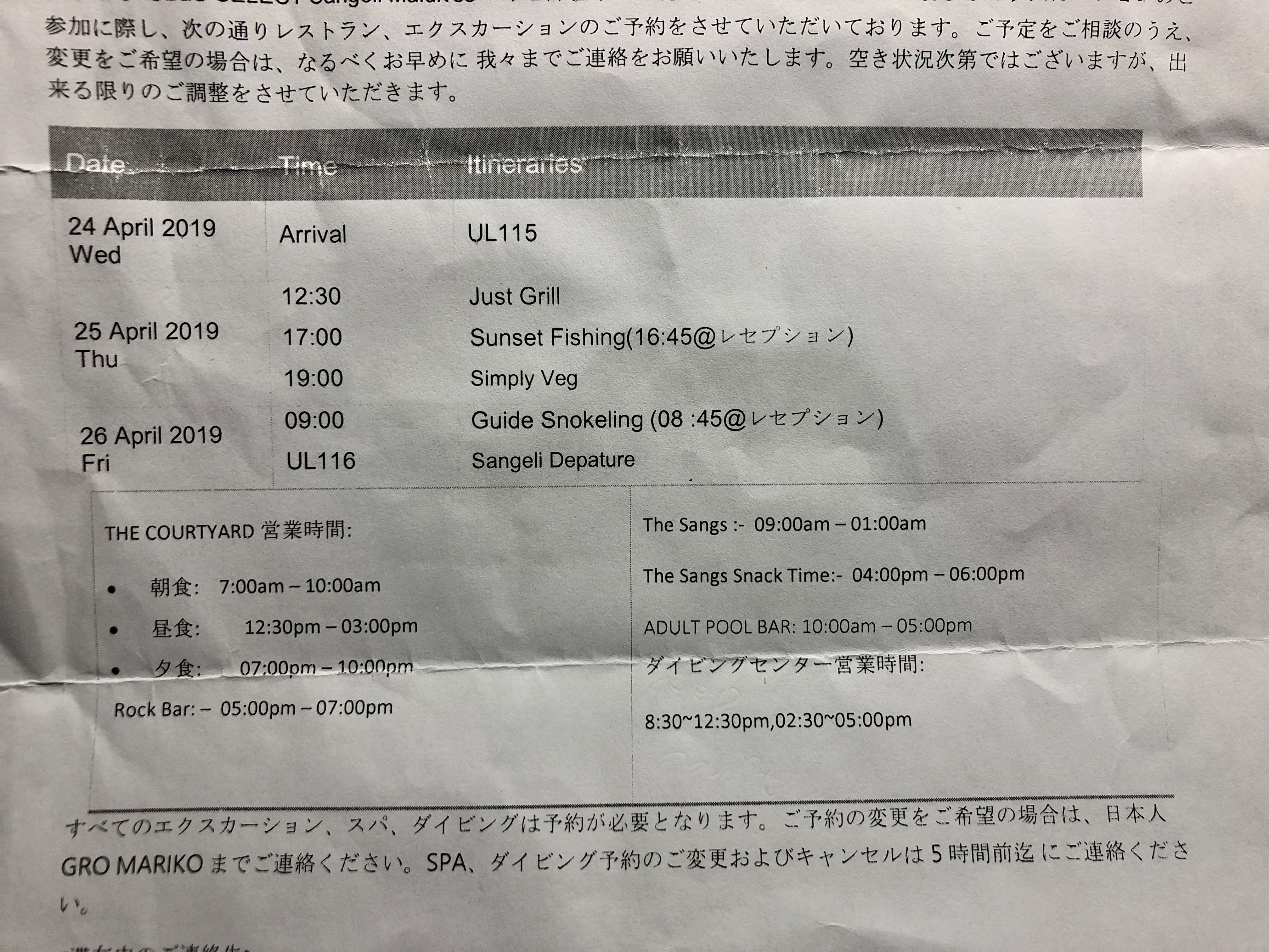 到着すると、スケジュールを組んでくれているので、こんな感じの紙をチェックインの時に渡してくれます!▼