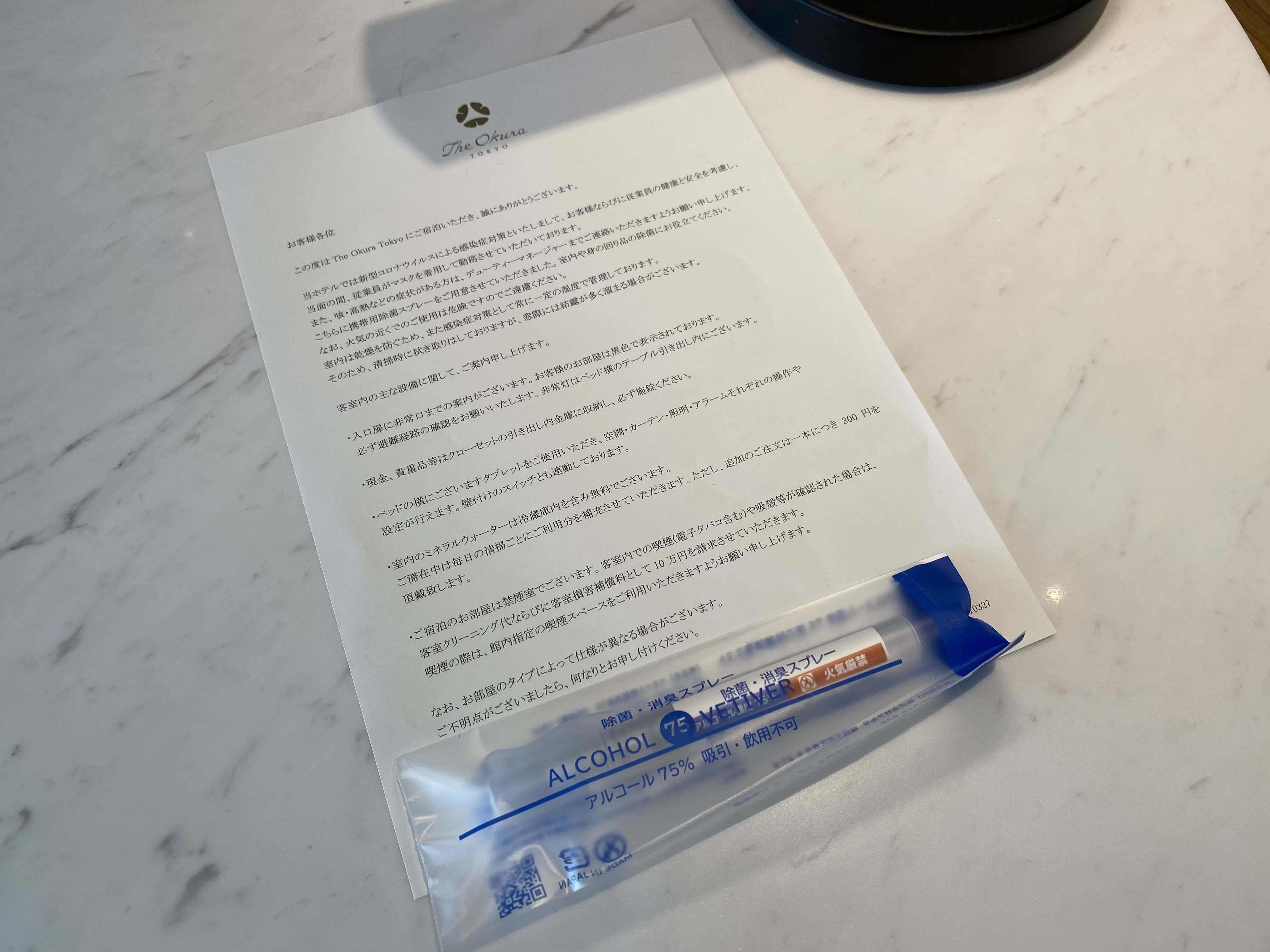 コロナ禍ということもあって、基本的にアルコールスプレーがもらえるんですが、パレスホテルのアルコールスプレー入れが斬新で一気にファンになった…!
