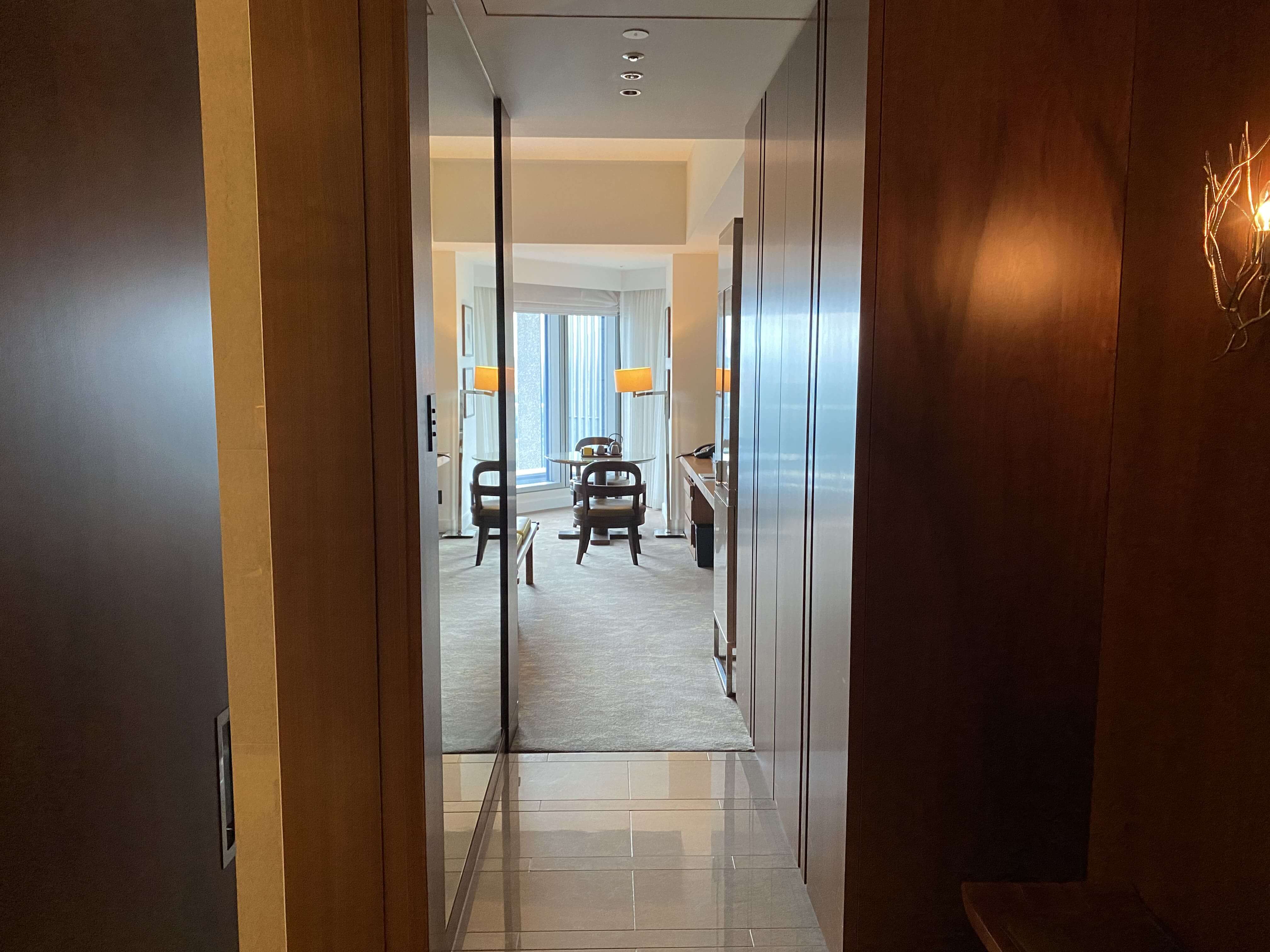 お部屋に入るとこのような景色。入ってすぐのサイドにバスルームがあって、奥にベッドルームなどがあるレイアウトでした。