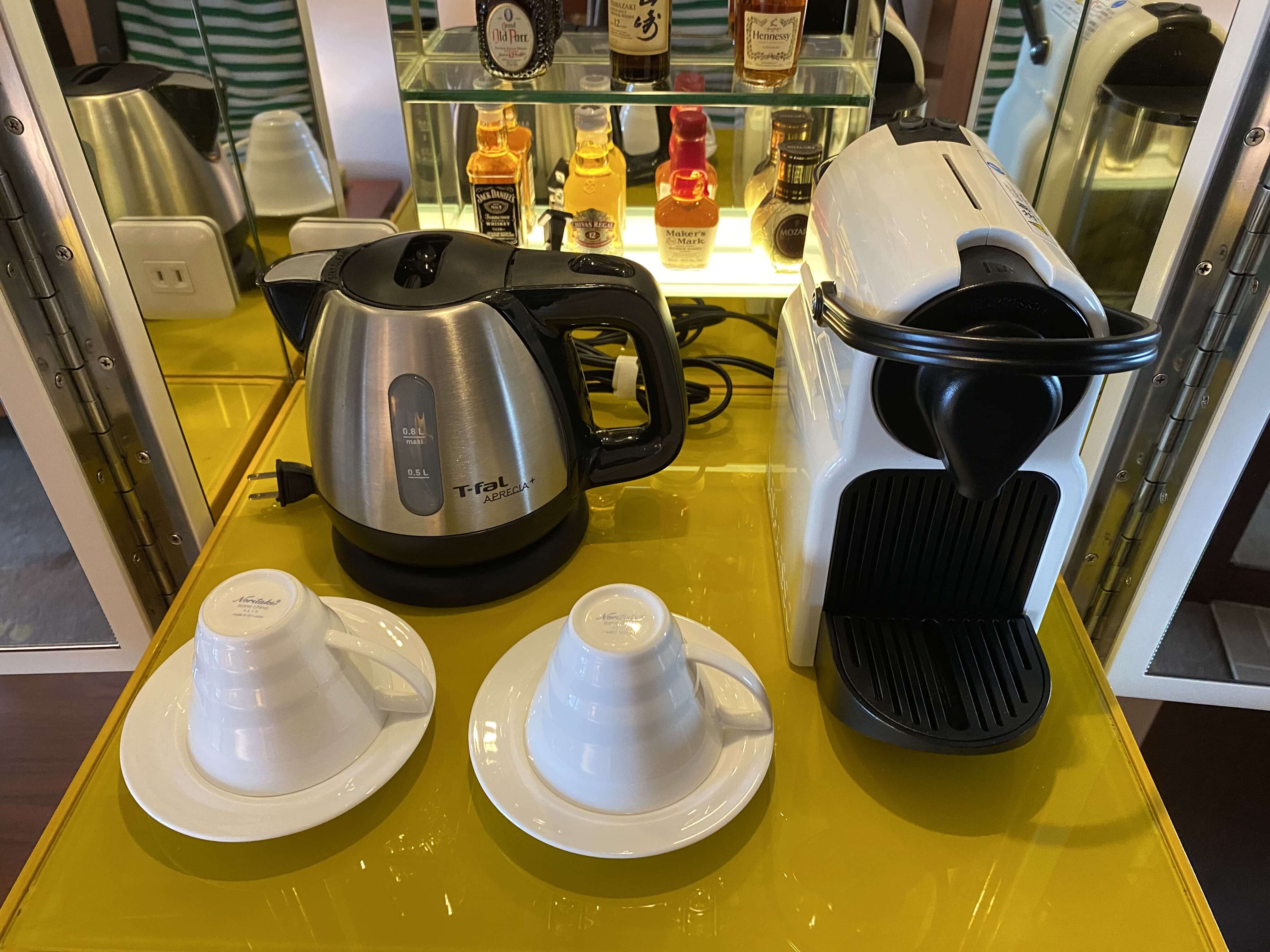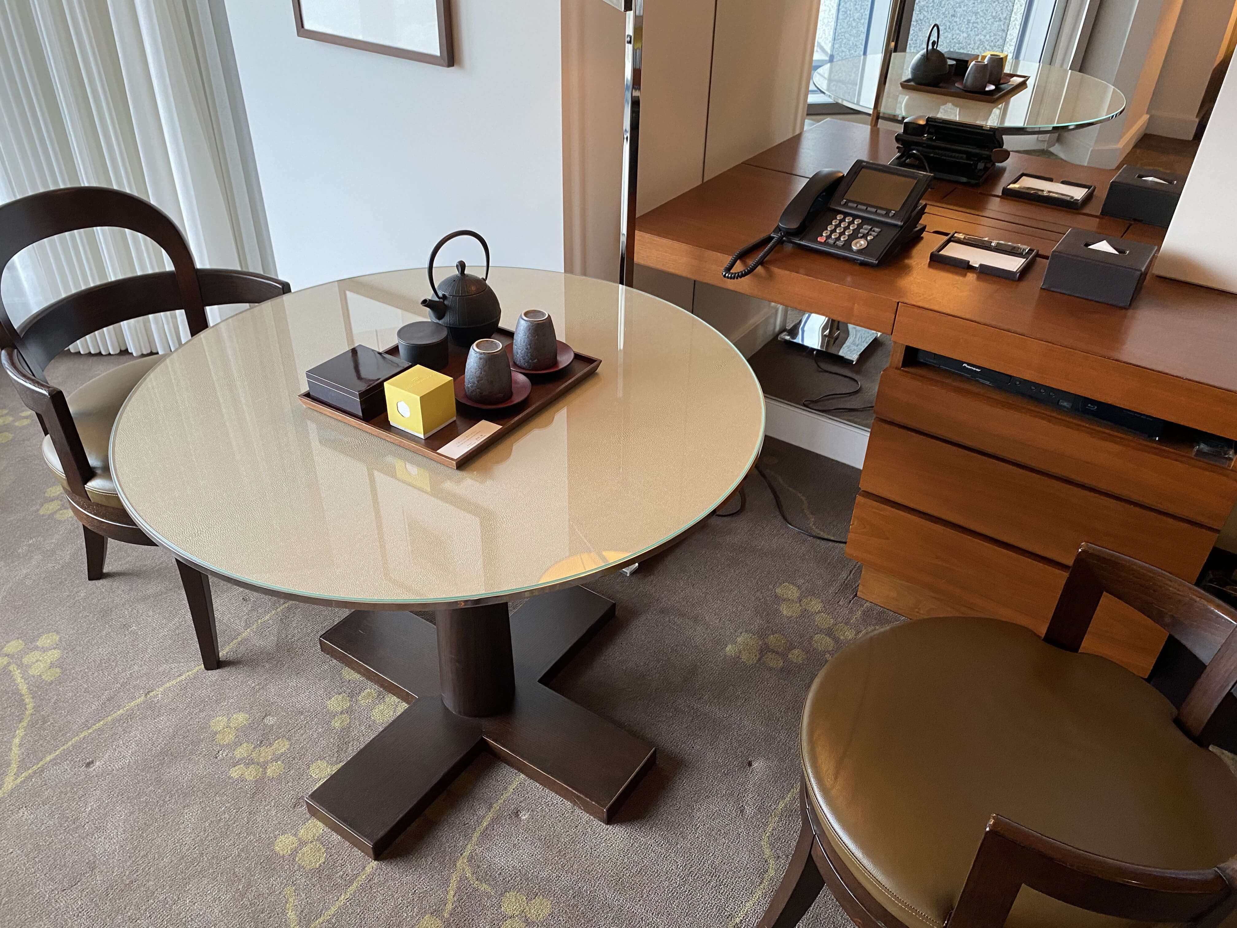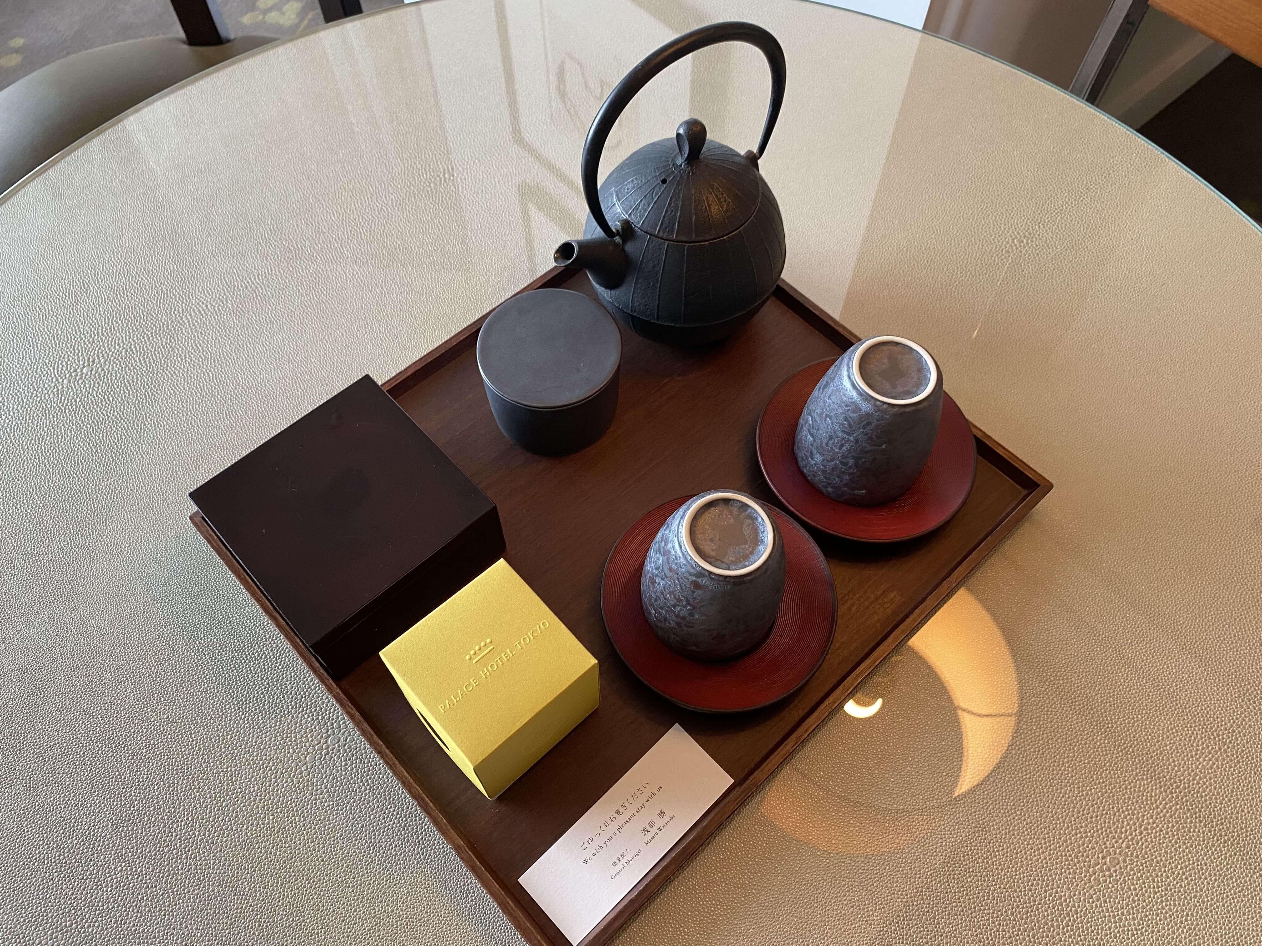 テーブルエリアには、日本らしさ全開のウェルカムフルーツならぬウェルカムお菓子とお茶のセット。