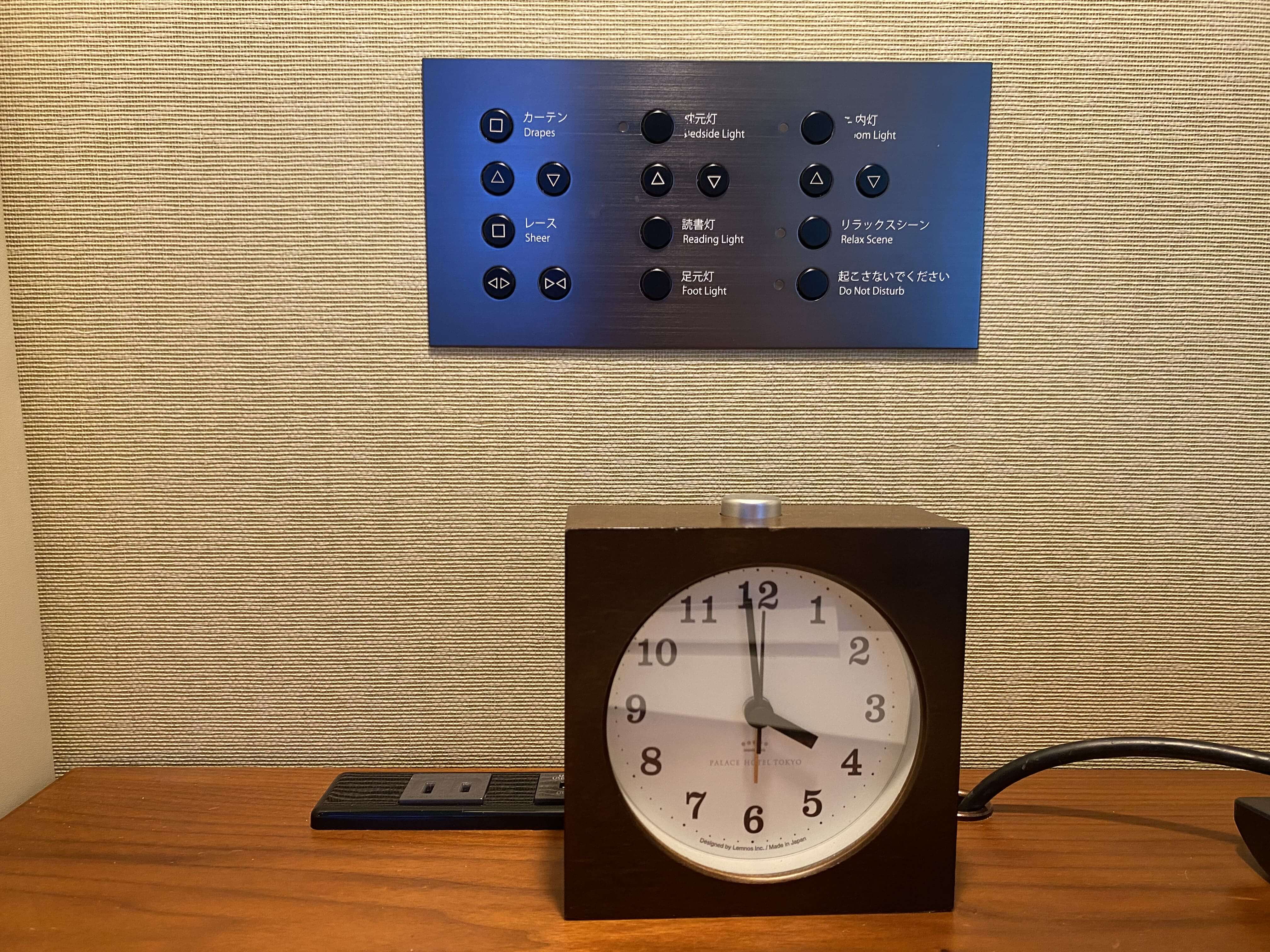 ライトのスイッチと時計と電話。時計は、パレスホテル仕様!