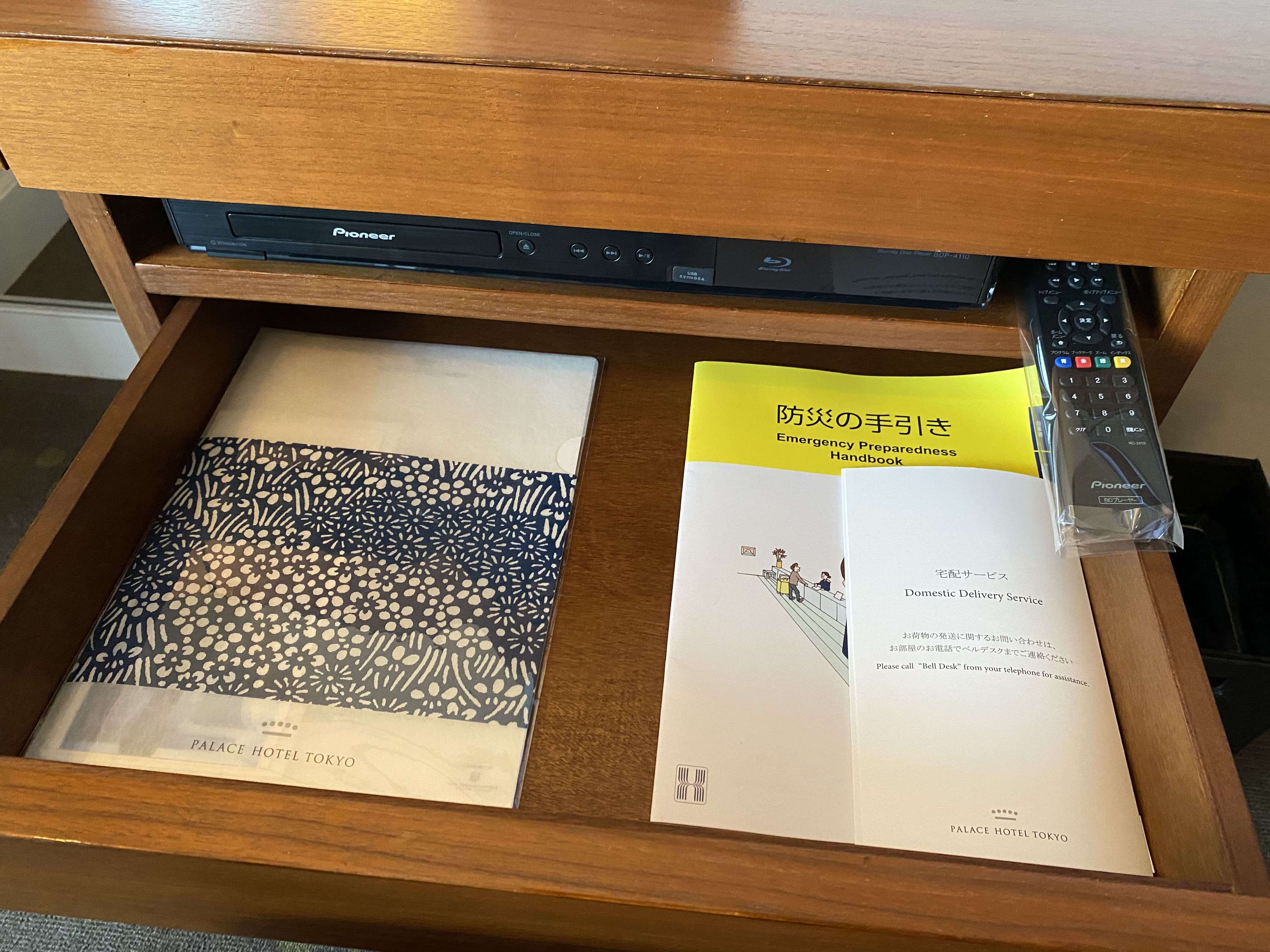 ▼電話の下の引き出しには、ブルーレイディスクプレーヤーやパンフレットが配置。