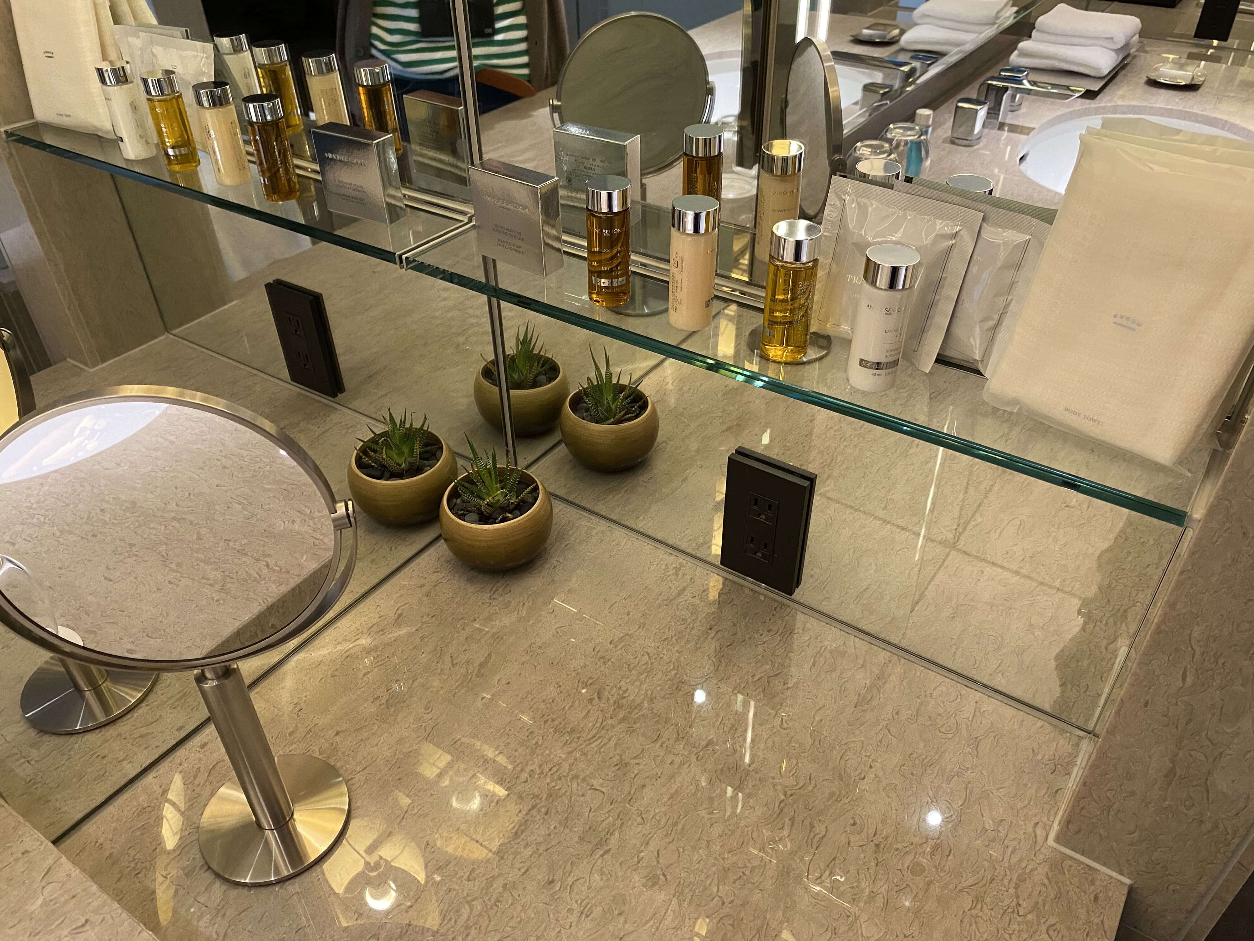 右側には観葉植物と拡大鏡。棚には、バスアメニティ!