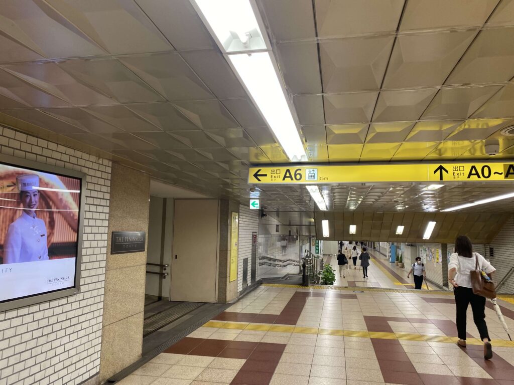 コロナの影響で閉鎖中の扉A6の出口からザ・ペニンシュラ東京に入れる入り口はいくつかあるようだったのですが、コロナの影響でほとんどが閉まっているようで…。ペニンシュラのエントランス横の出口にしかでられないような状態でしたので、ご注意ください。