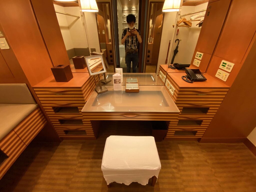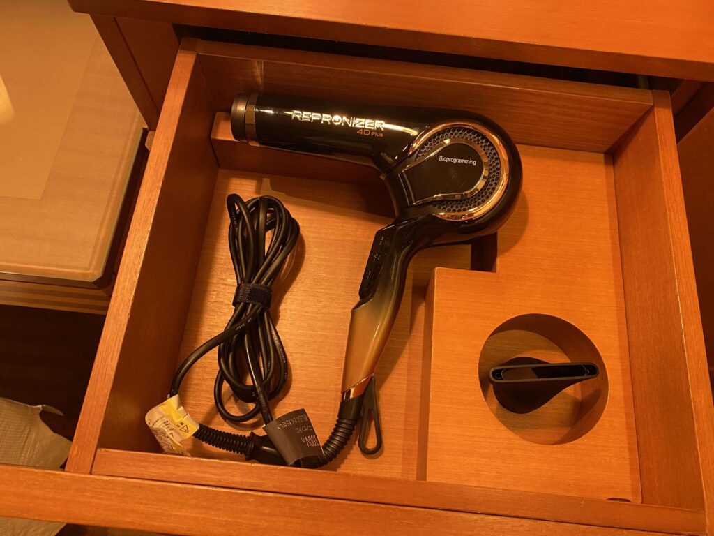 ちょっとみにくいのですが、ジュエリーボックスのあるところから右手の場所には、ネイルドライヤーもありました。さすがに他の5つ星ホテルにもありませんでした…。すげえ。