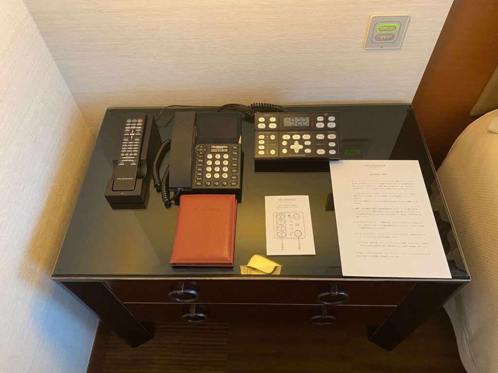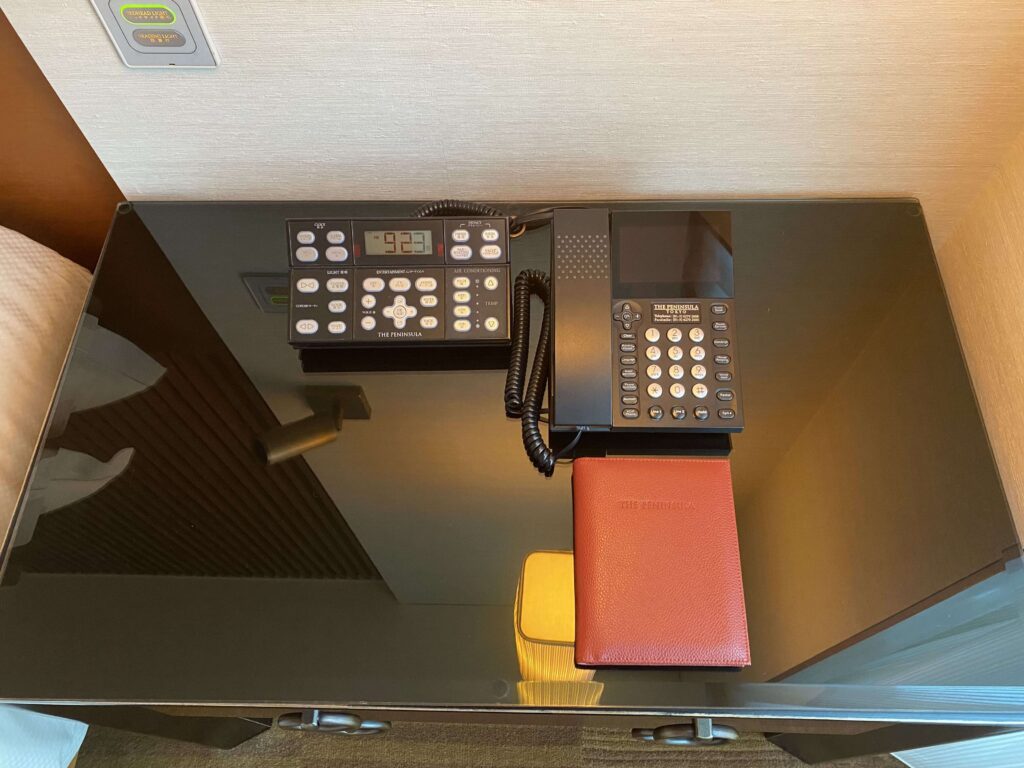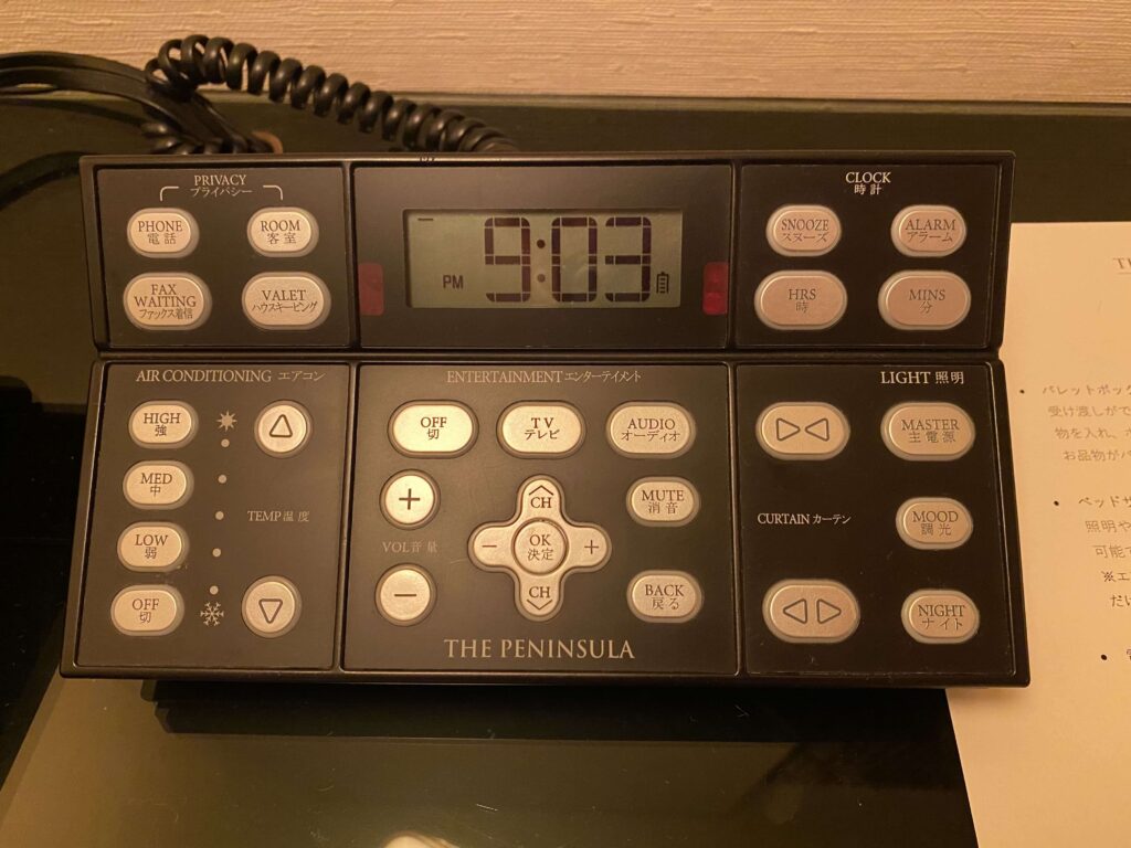 右上のボタンはみにくいのですが、ハウスキーピング、客室清掃、プライバシー(客室に外線を回さないでほしい、とフロントへメッセージを送れるボタン)、ファックス着信。