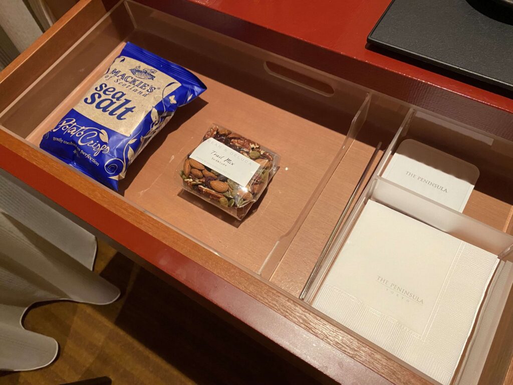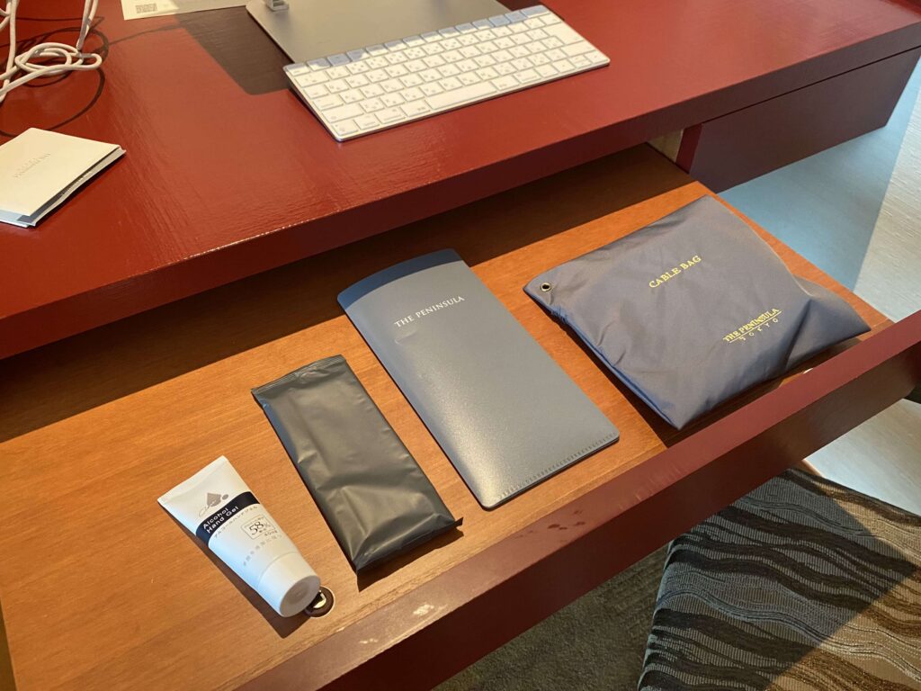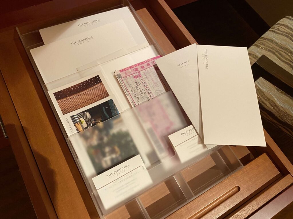 ペニンシュラって記入が必要なものがある場所に必ず新品のペンが置いてあるんです…。元々あったサービスかもしれませんが、アフターコロナの時代にも嬉しいですよね。