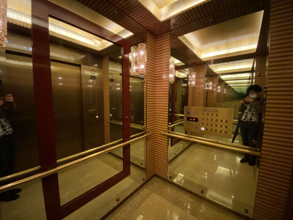 エレベーターの中。ほどよくラグジュアリー同じ香港を拠点とするシャングリ・ラは、シャンデリアとか無駄に豪華なのに、セキュリティガバガバで誰でも部屋に上がれる仕様だったので、一安心。僕はペニンシュラ派だわ絶対。
