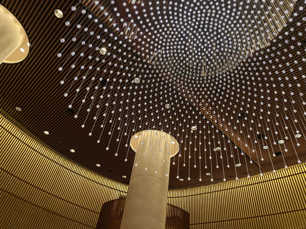 公式HPによると、花火とか蛍の光を表現したシャンデリアなんだとか。粋すぎて、言葉もでない。