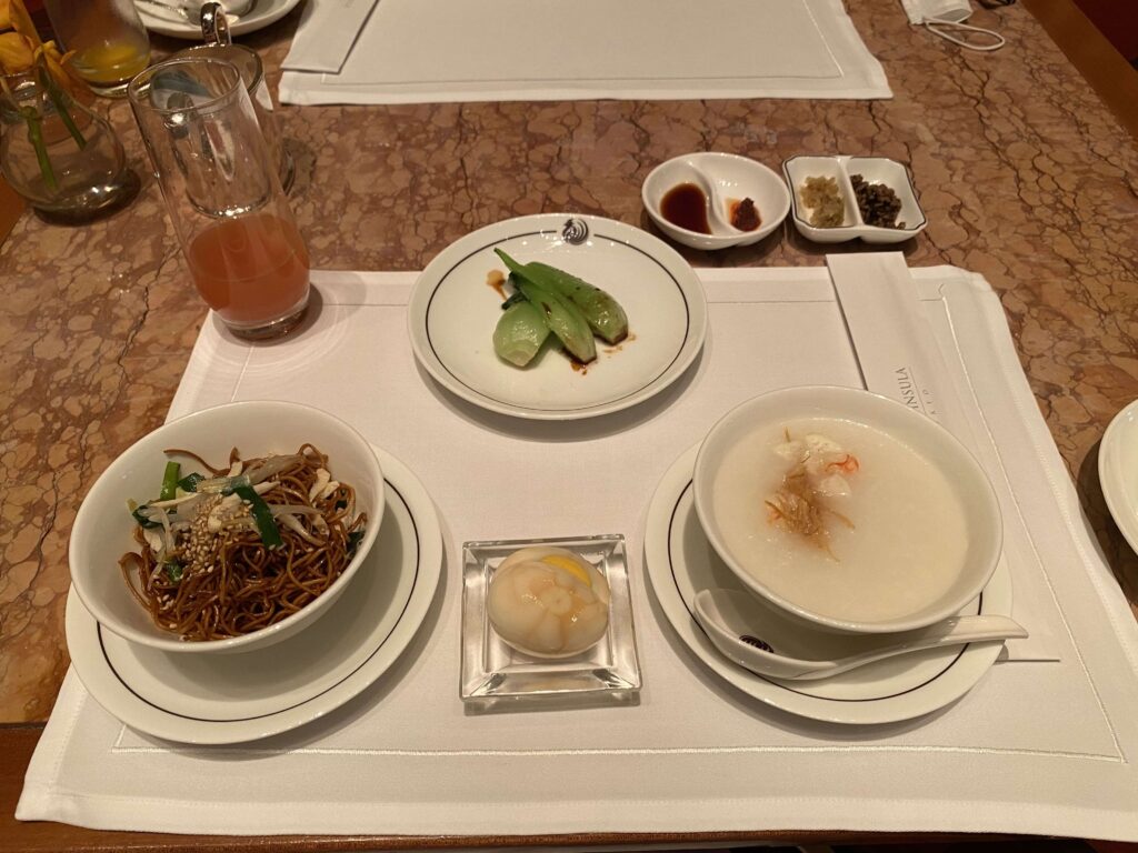 点心とチャーシュー入り饅頭、海鮮中華粥、プーアール茶で煮込んだ卵、鶏肉ともやし入り醤油焼きそばです▼