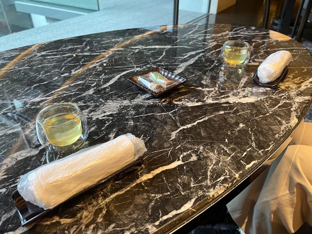 お手拭きとお茶と八橋を出してくださいました。やはり5つ星ホテルの中でも高いランクのホテルは、チェックイン時にゲストを立たせるようなことをしないなと改めて。