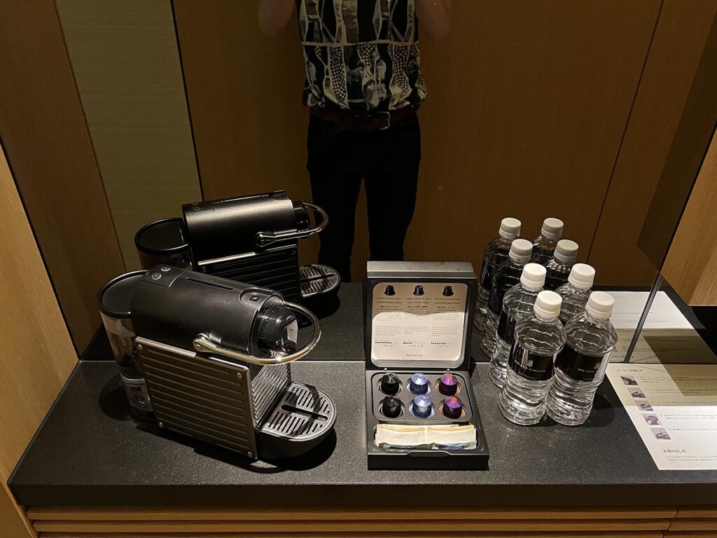 安定のザ・リッツ・カールトンのロゴが描かれたお水と、ネスプレッソ!ネスプレッソはホテルによって、カプセルの種類が違うので実は密かな楽しみ。最高です。