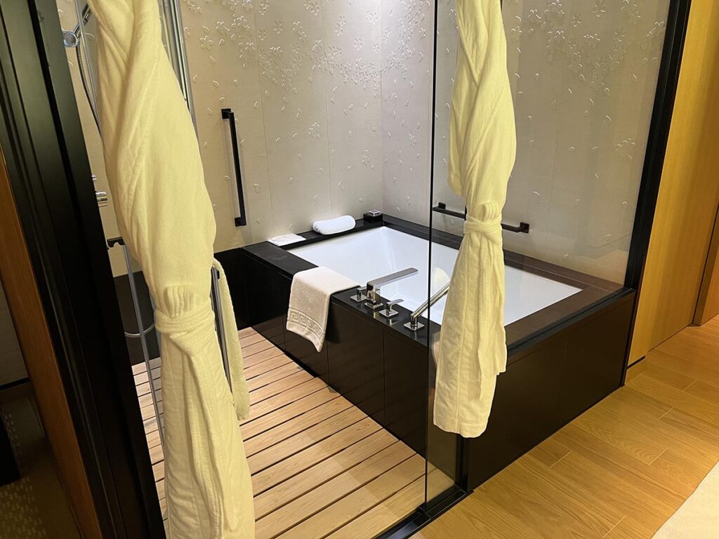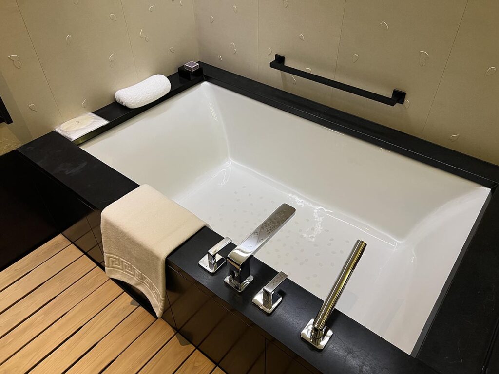 バスルームの全体図はこんな感じ。最初に紹介したミニバーコーナーのちょうど後ろあたりの位置になります。