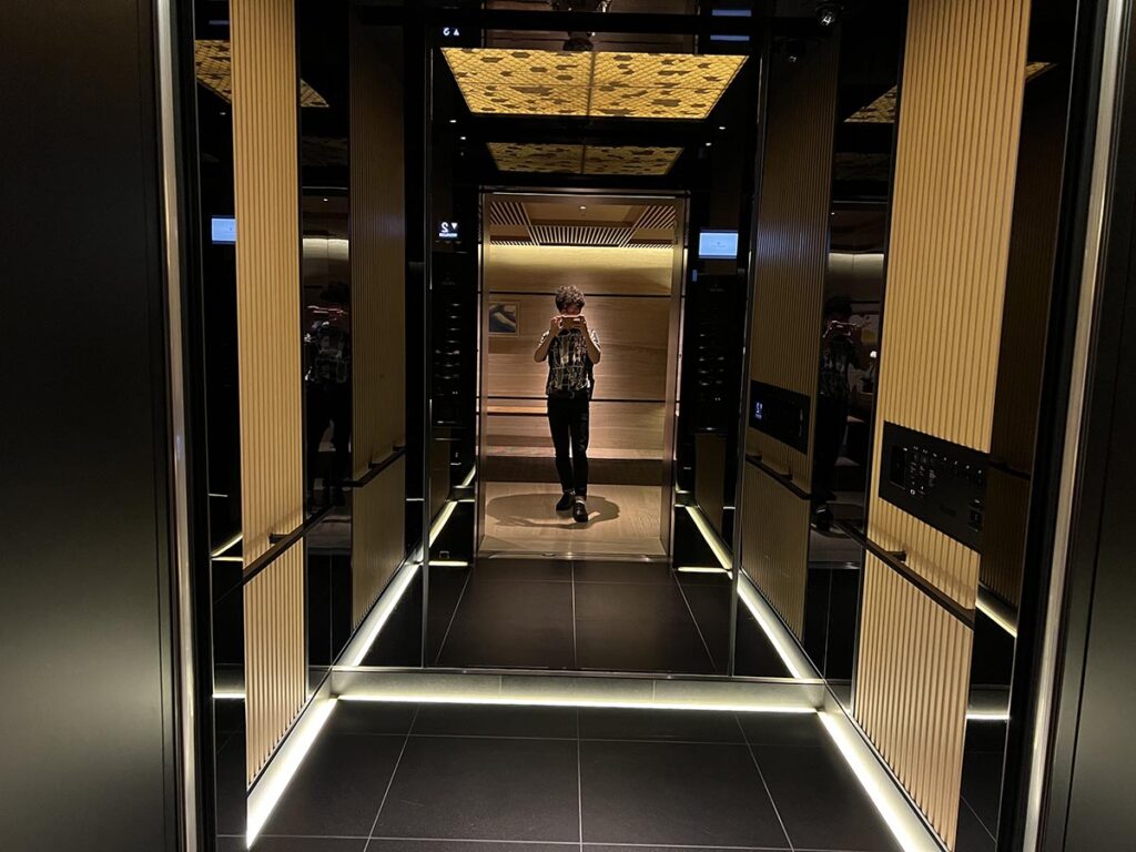 んでこちらが、エレベーター!黒と明るめの茶色の木材がマッチしていて、なんとも絶妙なラグジュアリー感。
