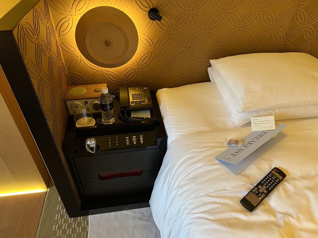 他のリッツと同じように、枕元に水、ベッドには朝食メニューやリモコン、お菓子が設置。