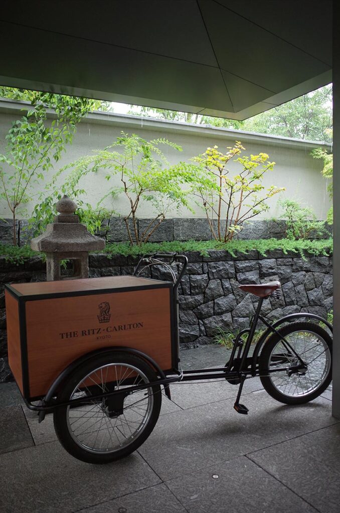 タクシー降り場(というか駐車場)から、エントランスの前にはリッツのロゴが入っている荷台が乗った自転車!後ろの植物や外壁がよい京都感を出していますね〜!
