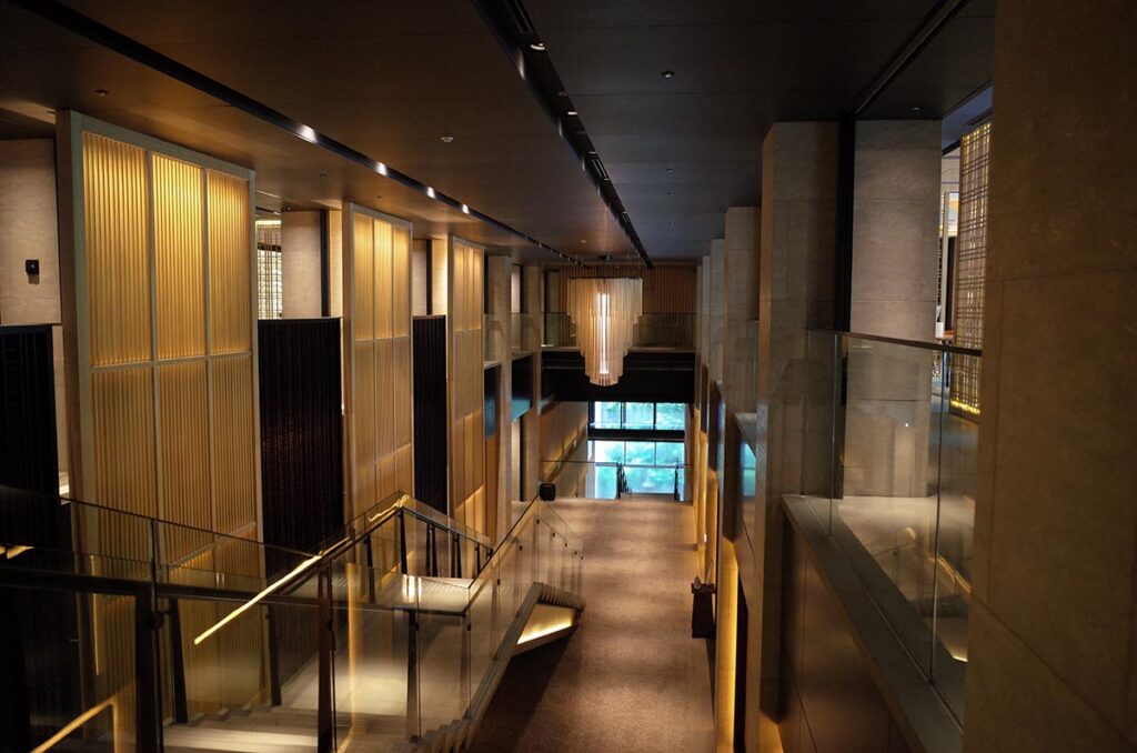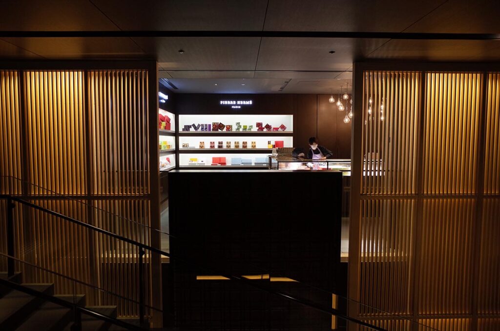 この通路部分を通過すると、リッツ京都の中心部となる部分に到着します。ここを中心にレセプションやアフターヌーンティーをするカフェ的なところ、あとはピエールエルメのブティックがあったりします。