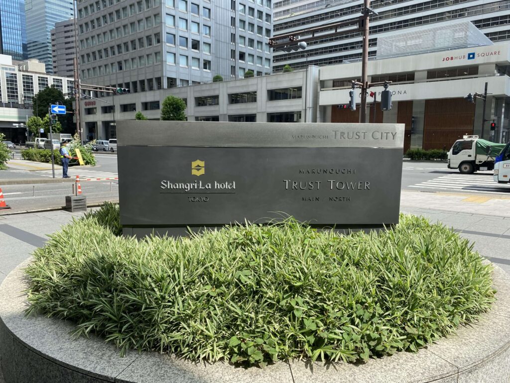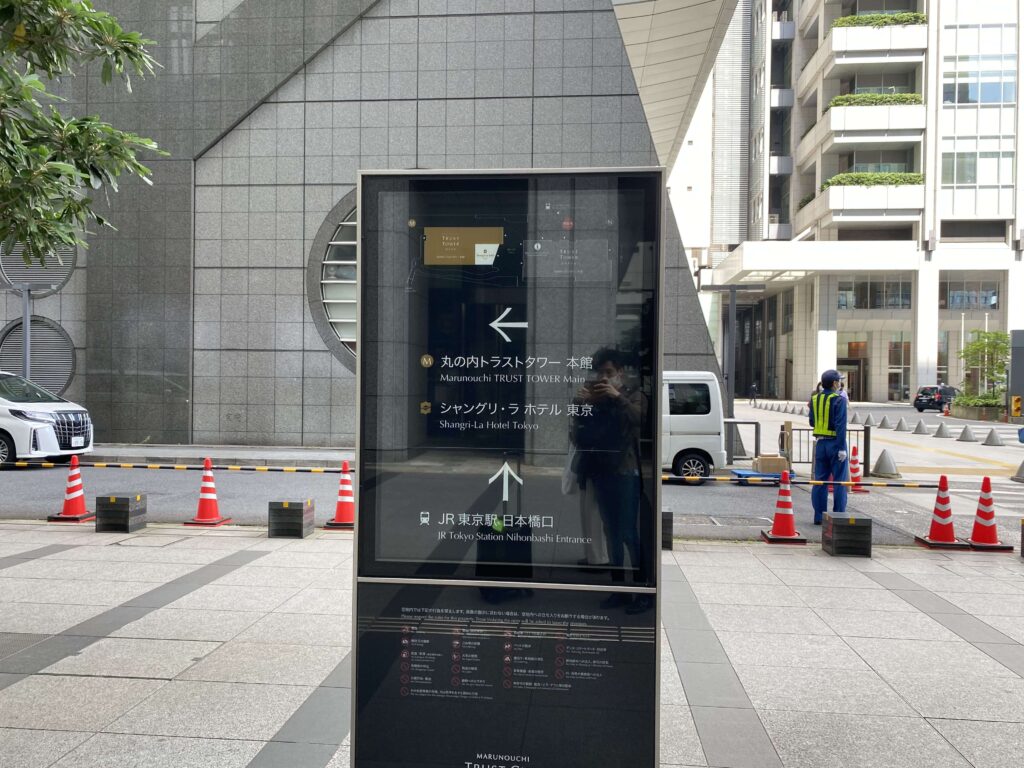 そこから右手にでると、すぐにシャングリ・ラ東京が入っている丸の内トラストタワーにすぐぶつかります!こんな感じで看板があるので、絶対に迷うことはありません!
