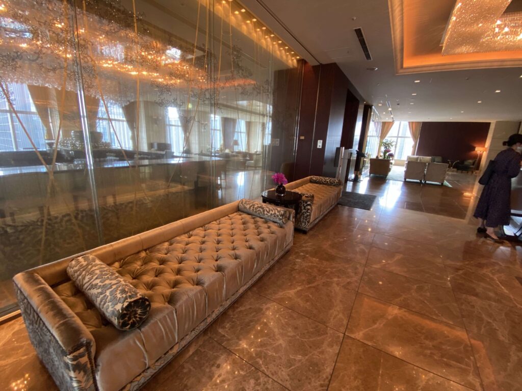 シャングリ・ラ 東京 1階受付シャンデリアに大理石の床。中央に配置されたソファ。このレセプションから、一気に雰囲気が変わり、まさにそこはラグジュアリーホテルの雰囲気でした。