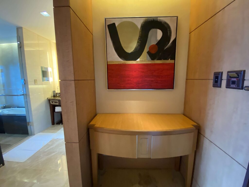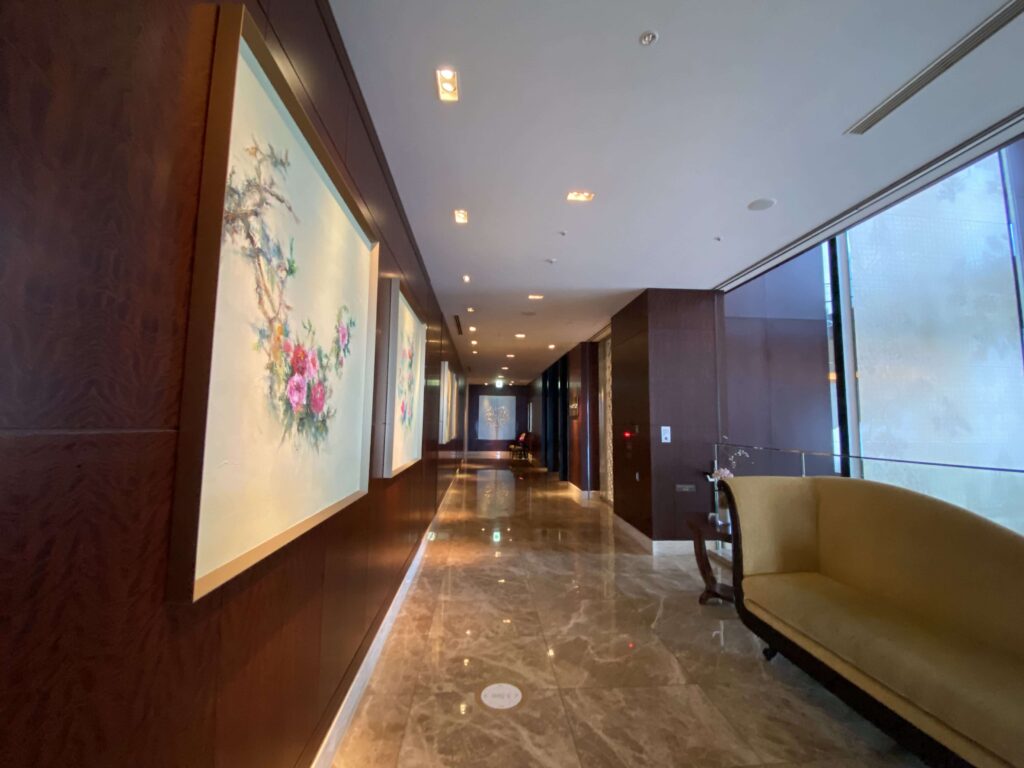 レセプションからエレベーターフロアに向かう通路は、アートが展示されていて、いかにも高級ホテル!といった雰囲気。朝の9時なので、人が誰もいません!36時間ステイ(というか朝のチェックイン)のよさはここにもある…。全然人と会わない!