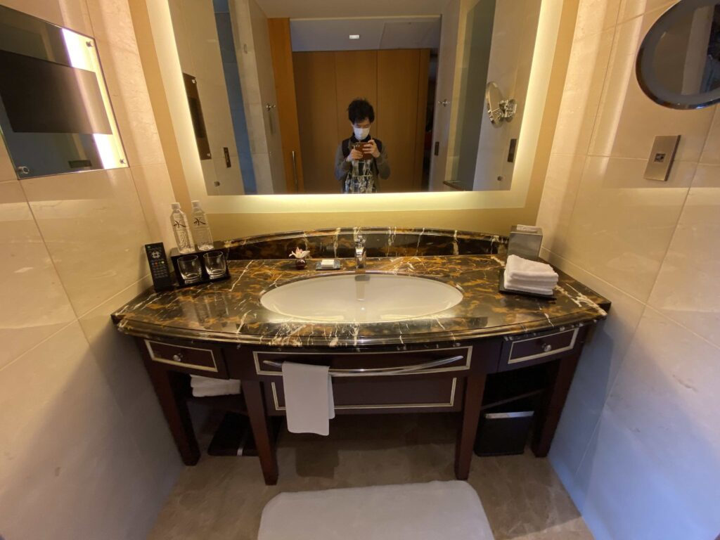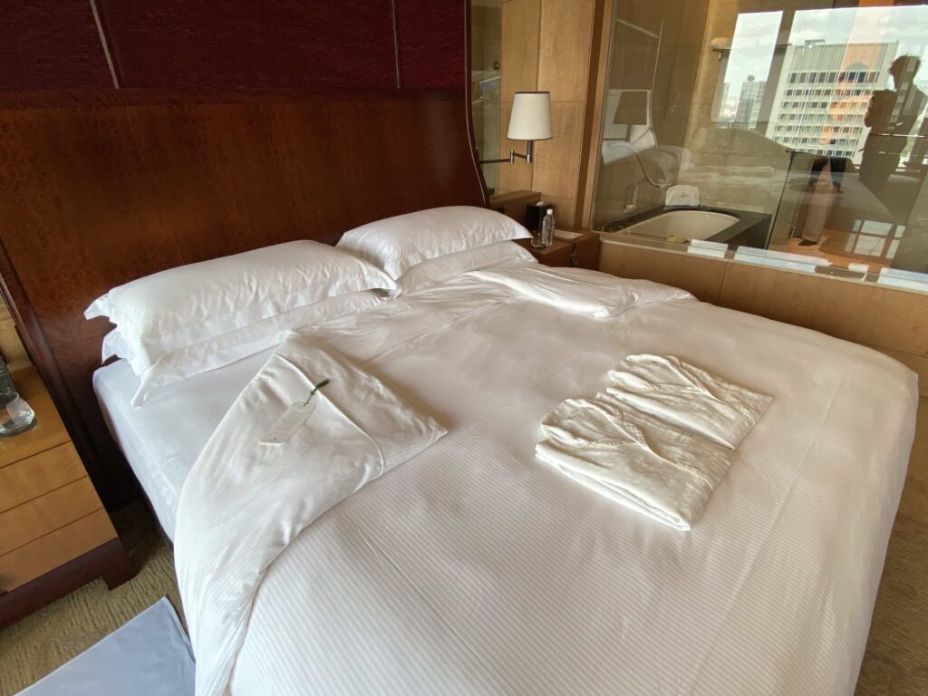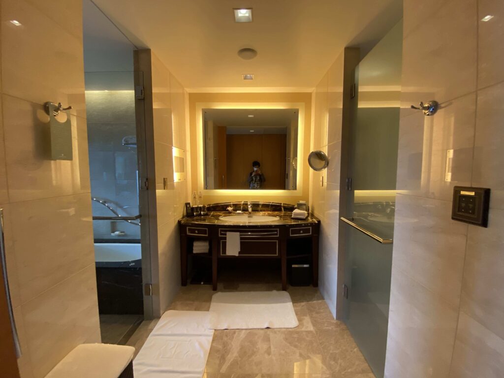 てことで、バスタブルームを見ていきましょう!アジアのホテルによくある、ベッドルームとバスルームの間がガラスの形式でした。