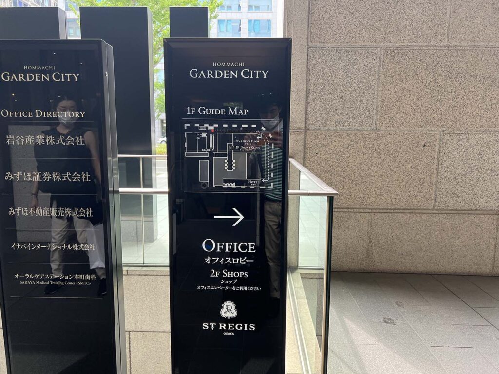 セントレジス大阪は、本町駅直結なので、駅から出たらすぐにこのような看板があります!とりあえず地上に出た方がわかりやすいので、地上に出ましょう♪