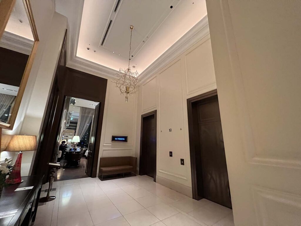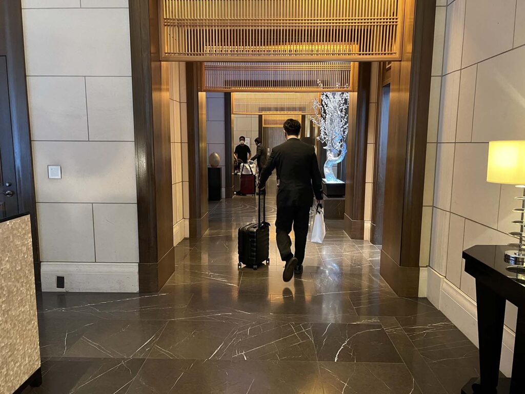 チェックインも無事終わらせ、お部屋へ。セントレジス大阪は、1階〜レセプション、レセプション〜お部屋のフロアまでのエレベーターが違うので、奥まで移動します。