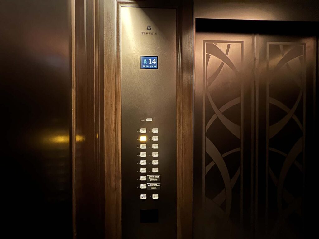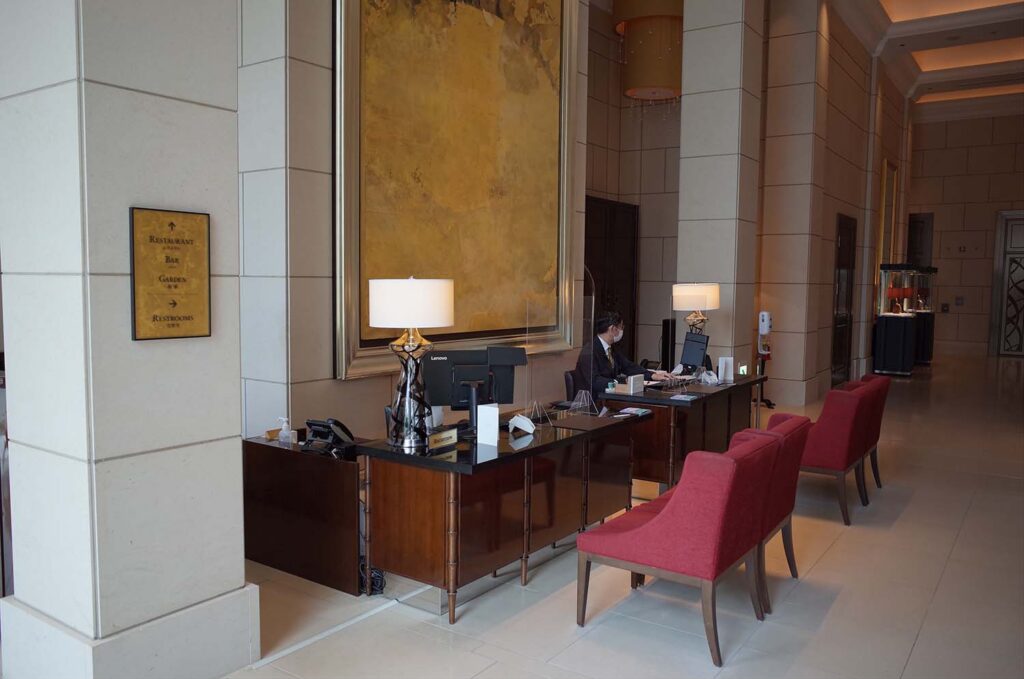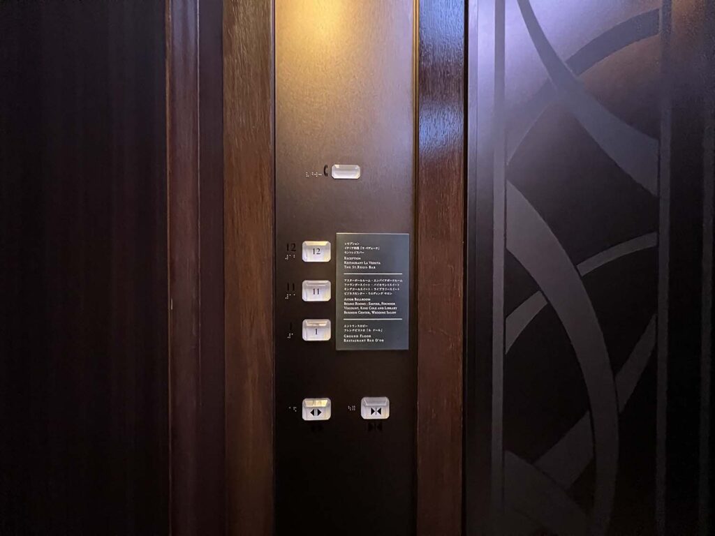 セントレジス大阪のレセプションは1階ではないので、ここで予約の名前を告げてレセプションフロアへ。もちろん荷物は預かっていただき、お部屋まで運んでいただけます。