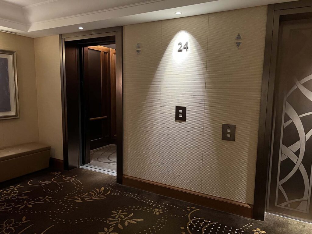 今回のお部屋は24階!早速向かいます。荷物は、1階の時点で預けていて、特に荷物はないので、特にエスコートもなく、自分たちだけで向かいます。