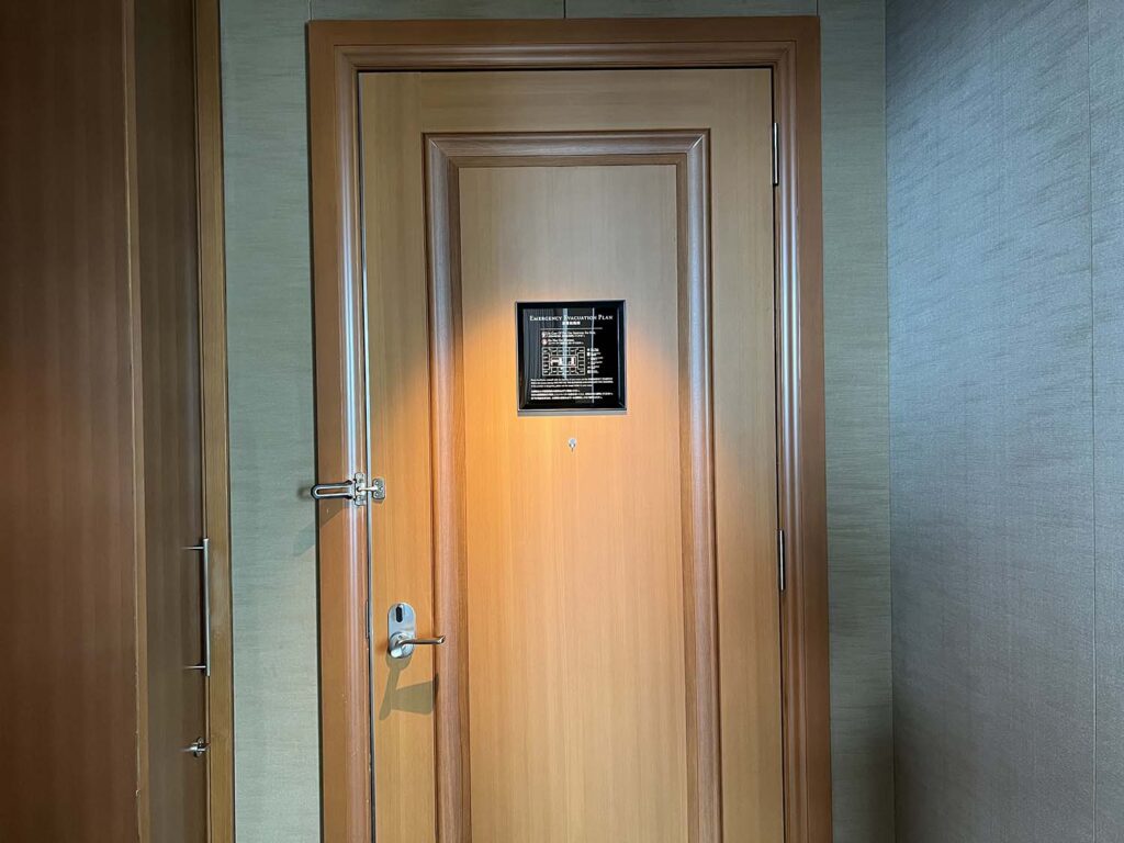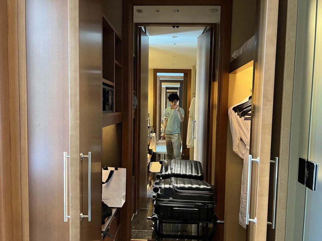 セントレジス大阪のレイアウトとしては、正方形のお部屋で手前側半分にバスルームと荷物入れ、奥側の半分にベッドルーム&リビングルームがある配置です。
