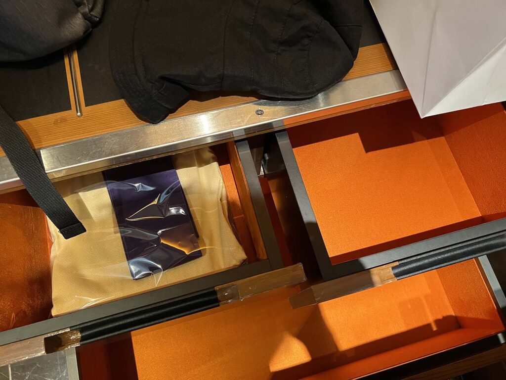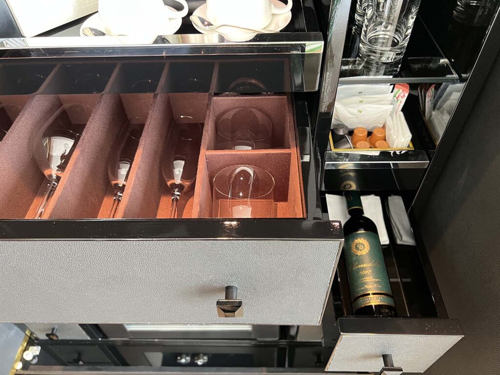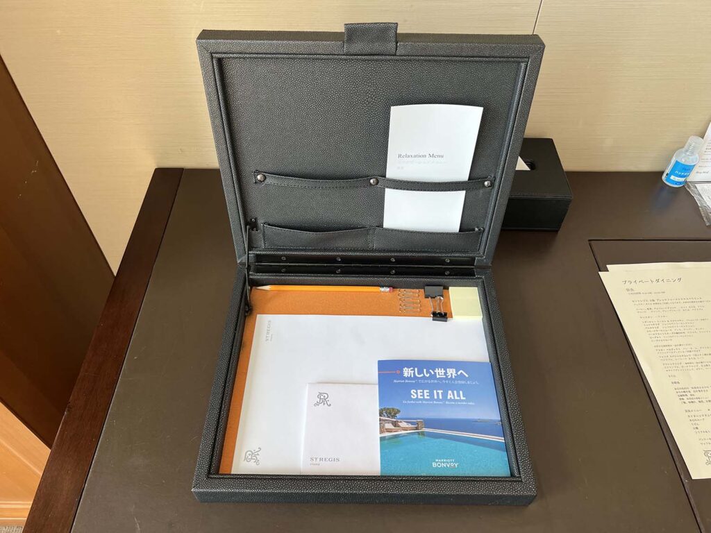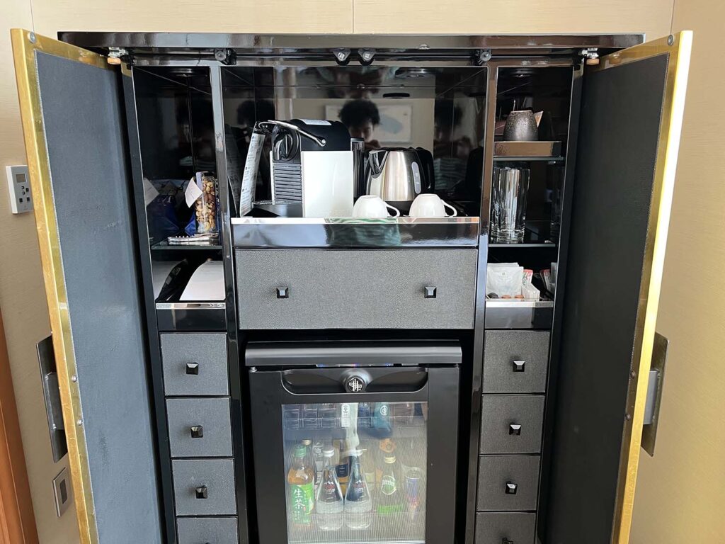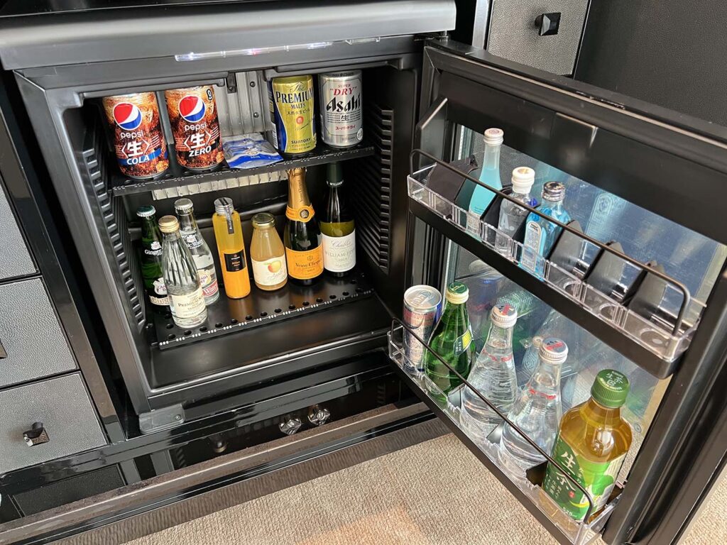 冷蔵庫の中身はこんな感じ。フォーシーズンズやアマンといったブランドだったりすると、そのホテルのオリジナルドリンクがあったりするのですが、セントレジス大阪はないようで…。何も開けずにノータッチで終わりました!