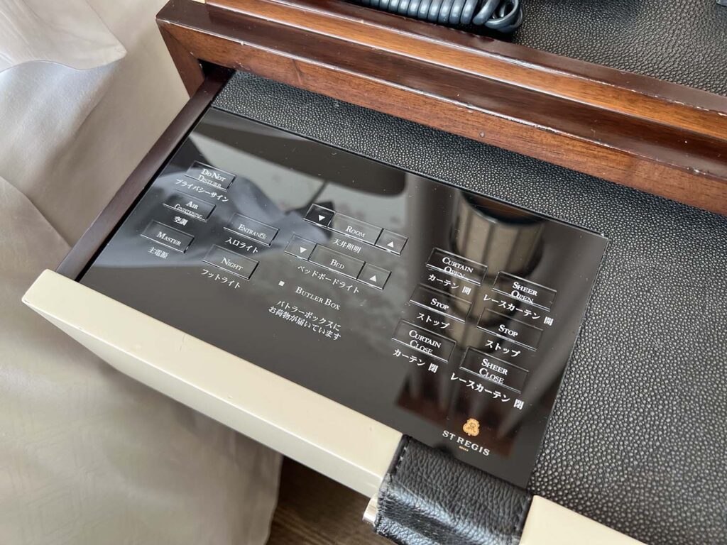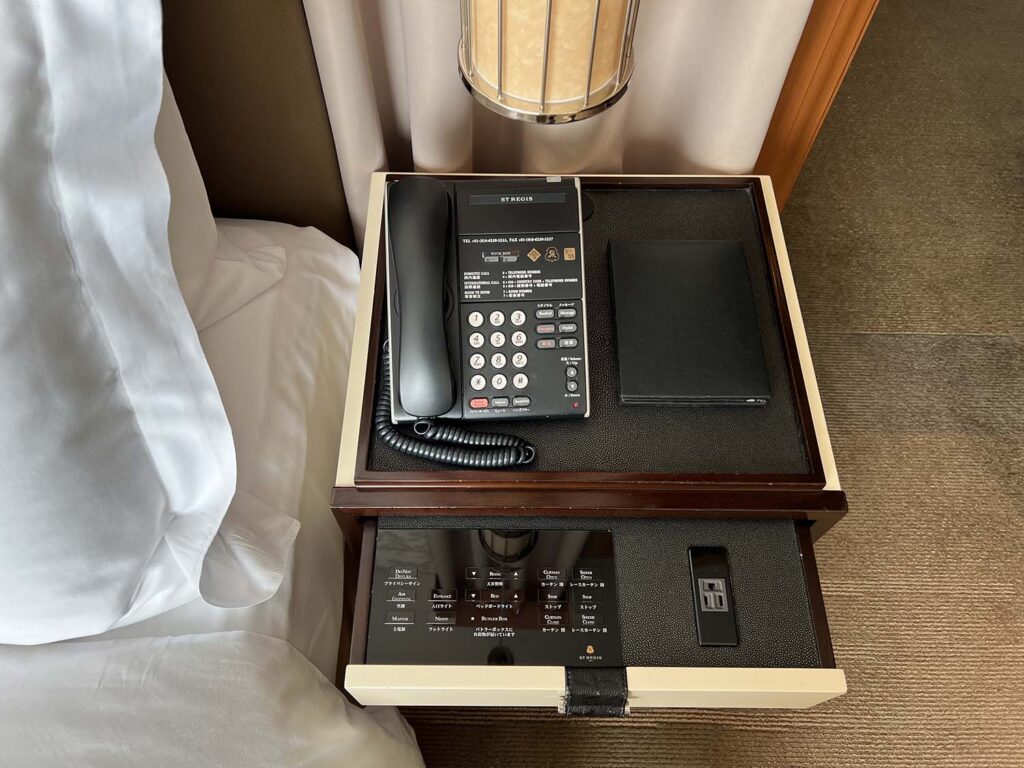 セントレジス大阪のベッド周りは、とてもスッキリ。引き出しにをダスト、お部屋のスイッチがあるので、ここで調整可能です!