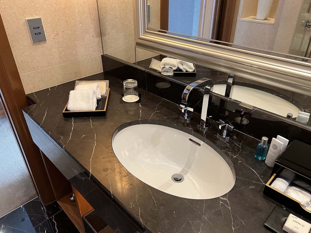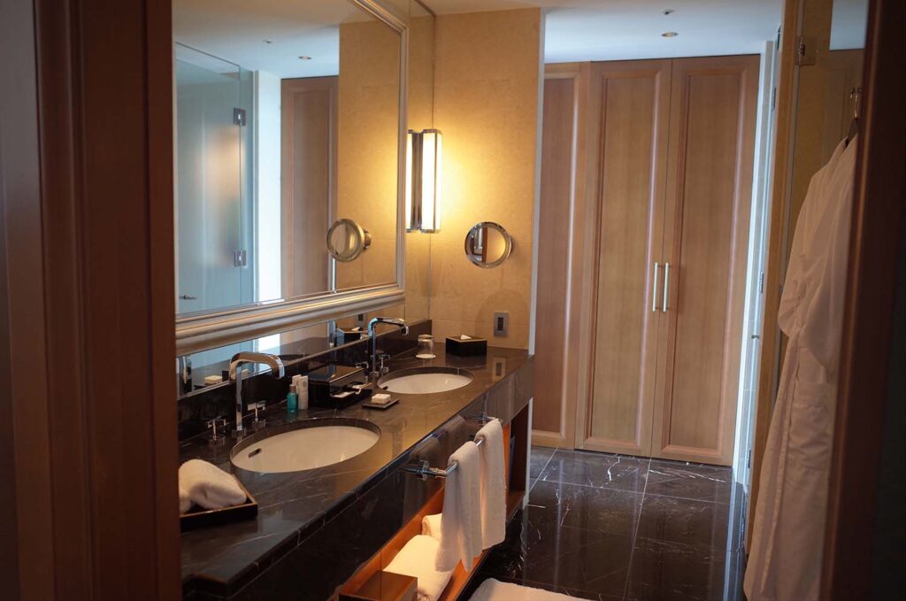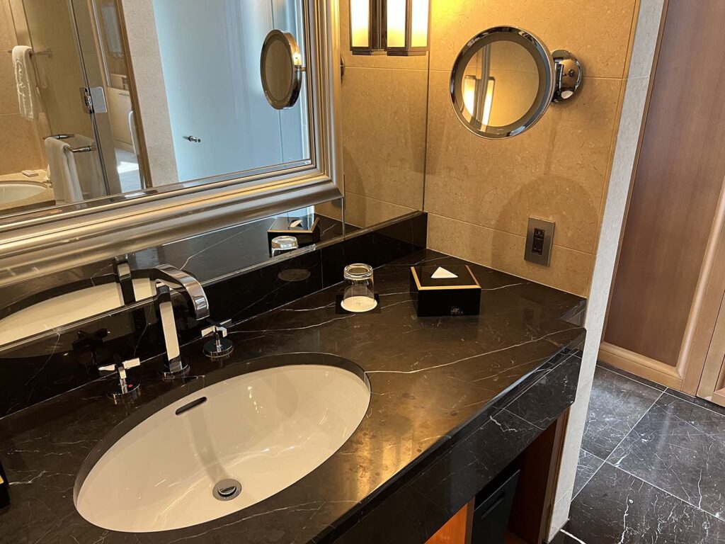高級ホテルのランクの高いお部屋にしかない、ダブルシンクもしっかり配置。最高です。彼女ちゃんと2人なので、朝と夜、本当に助かるんですよね。