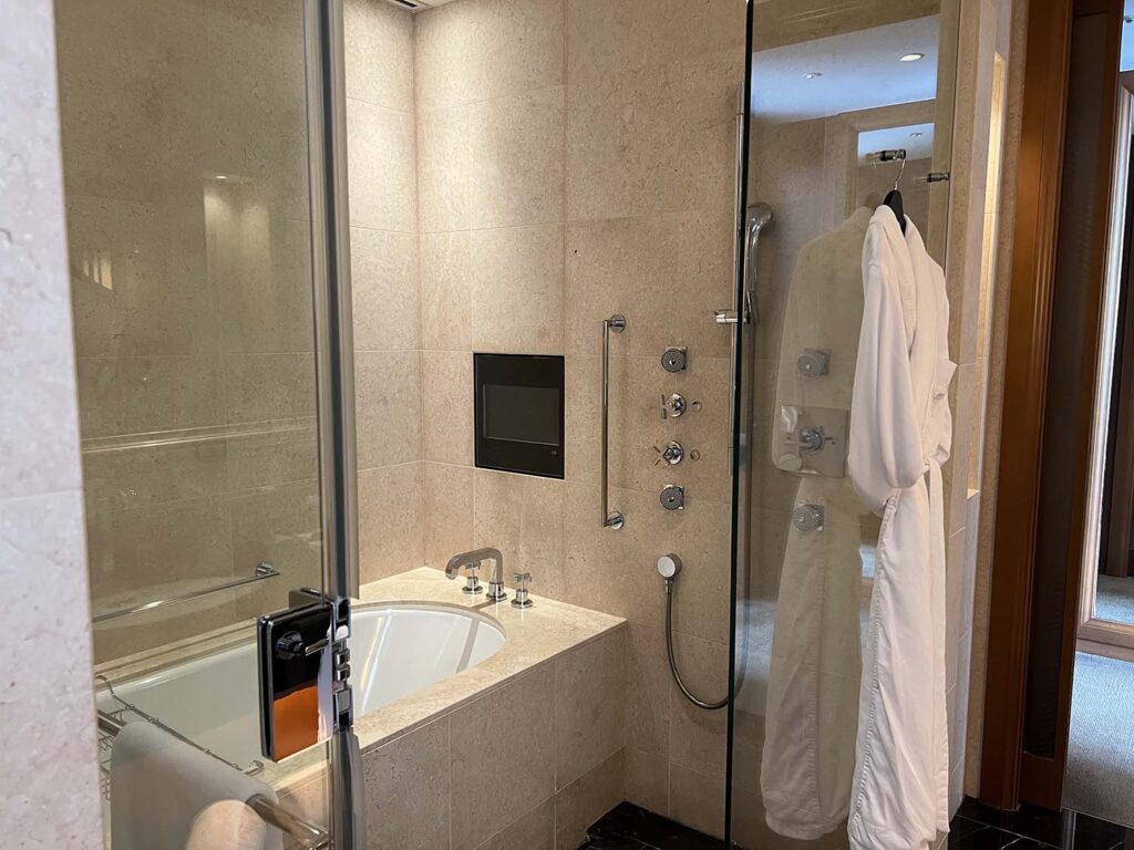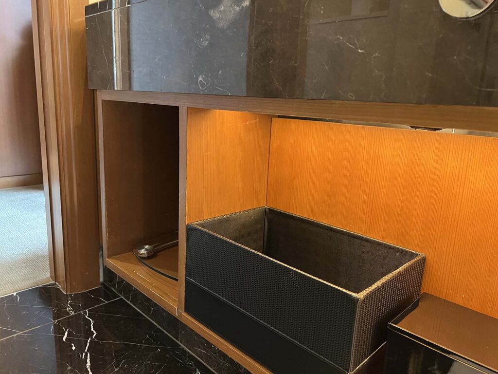 こちらサイドにはちょっと見にくいですが、体重計が。そして逆を向くと、バスルームがあります。大理石でできたとても高級感のあるバスタブルームですね。