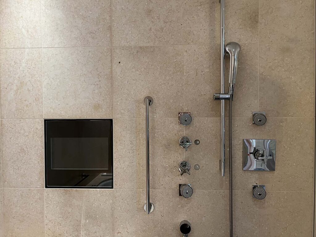 ちゃんとモニターもあるし、レインシャワーと可動式どちらもあるので、とても使いやすいシャワールーム。