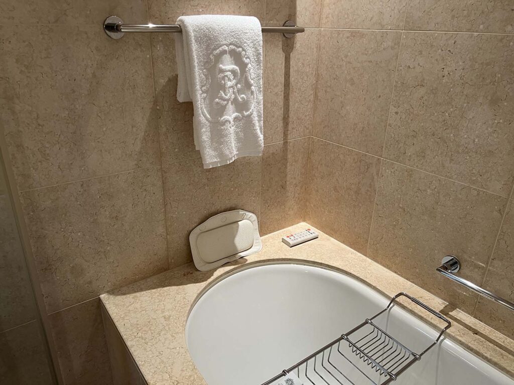 バスタブの大きさは、身長170cm体重55kgというTHE 日本人の体型の僕ですが、しっかりと足を伸ばせて広いバスタブでした!ちゃんとバスピローもあってゆっくりできる〜!
