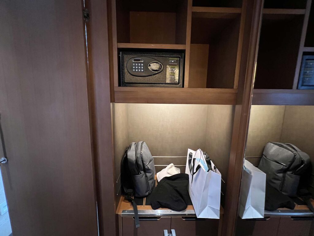 最後にお楽しみのバスルームのレビューに移りましょう。入り口部分からバスルームを覗くとこんな感じ。奥にクローゼットがあり、広い収納スペースがあります。